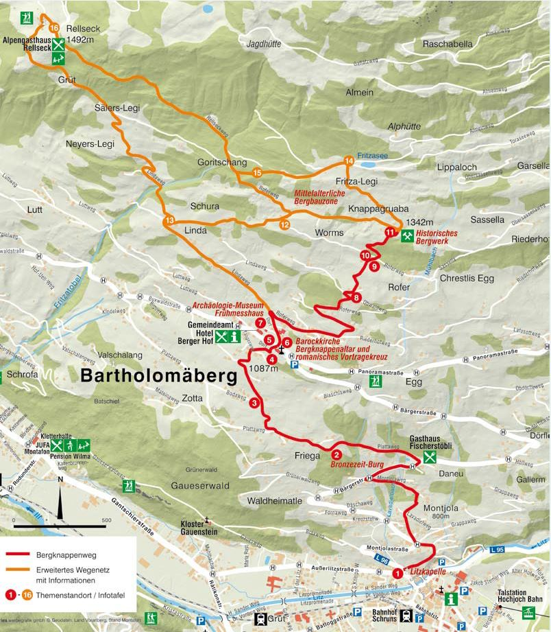 Entlang des Bergknappenwegs sind von der Litzkapelle über die bronzezeitliche Burg im Friaga Wald und dem Höhenweg in der Allmein am Fritzensee oberhalb der Knappagruaba zahlreiche Informationstafeln zur frühen Besiedlungsgeschichte und zum Bergbau aufgestellt, die den Wanderer über interessante und wichtige Stationen zur Geschichte am Bartholomäberg informieren. Im Museum Frühmesshaus Bartholomäberg können die Eindrücke und die Erkenntnisse in der musealen Präsentation sowie in einer Sonderausstellung zur Besiedlungs- und Bergbaugeschichte des Montafons vertieft werden.