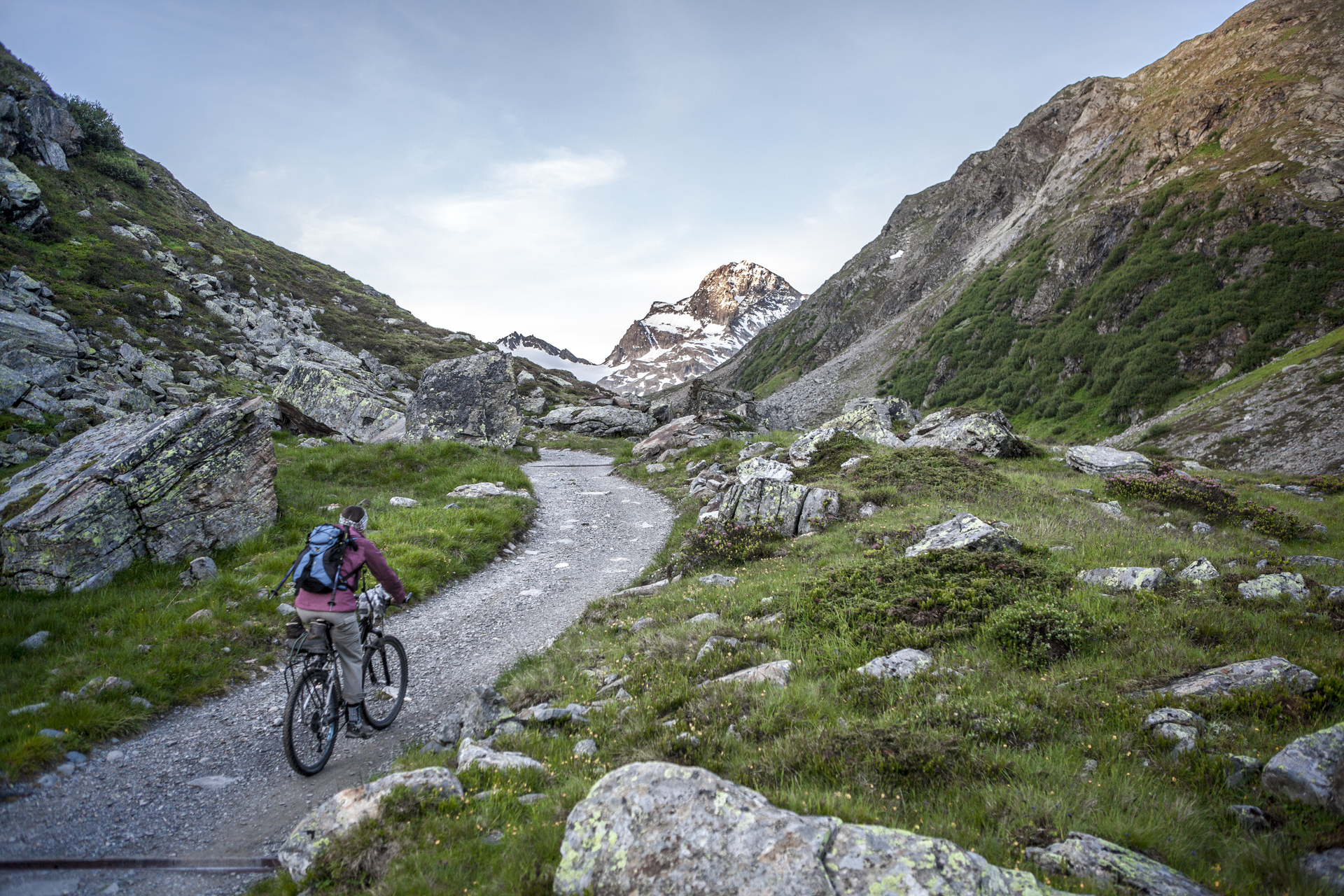 Diese Tour führt an den Fuße des imposanten Ochsentaler Gletscher im Silvretta Gebirge. Diese Mountainbike Tour wird in erster Linie von Bergsteigern als Bike & Hike/Climbing Tour genutzt. Der Anstieg zur Wiesbadener Hütte ist sehr steil und teiweise nicht bzw. kaum fahrbar und eignet sich daher nicht für Ausflugsfahrten. Zudem sind speziell am Silvrettasee sehr viel Wanderer unterwegs. Hier sind die speziellen Hinweise zum Verhalten zu beachten - siehe unter weitere Infos.