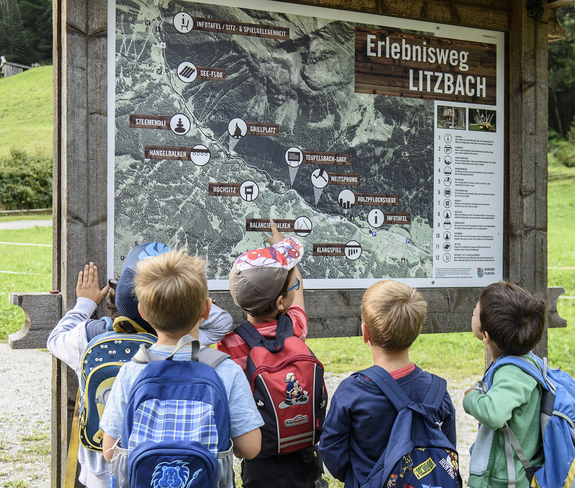 Gestartet wird beim "Felsa Parkplatz" und folgen dem Weg über die Brücke nach links und taleinwärts der Litz entlang. Es geht am Eingang der Montafoner Sagenfestspielbühne vorbei. Kurz danach folgt eine kurze Steigung und Du kommst an der ersten interaktiven Station vorbei. Nach dieser Station kannst Du beim Vorbeigehen auf der rechten Seite eine lustige Wetterstation besichtigen. Es geht weiter leicht bergwärts und Du kommst nach ca. 5 min am Teufelsbach-Wasserfall vorbei.