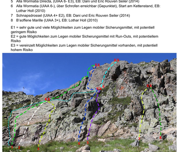 weitere Informationen dazu sind auf der Webseite der Wormser Hütte und Sektion Worms zu finden: https://www.dav-worms.de/index.php/klettern/klettergarten-wormser-huette. Obwohl das lose Gestein weitgehend aus den Routen geräumt wurde, muss mit lockeren Steinen und somitSteinschlag gerechnet werden. Das Tragen eines Helmes (Kletterer und Sicherer) wird eindringlich angeraten.Für die Richtigkeit der Angaben kann keine Gewähr übernommen werden! (Stand 2020, Sektion Worms).