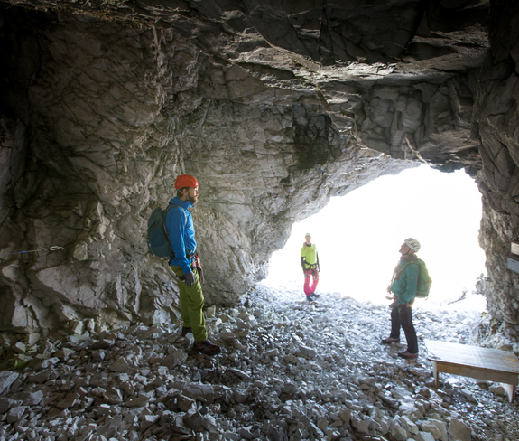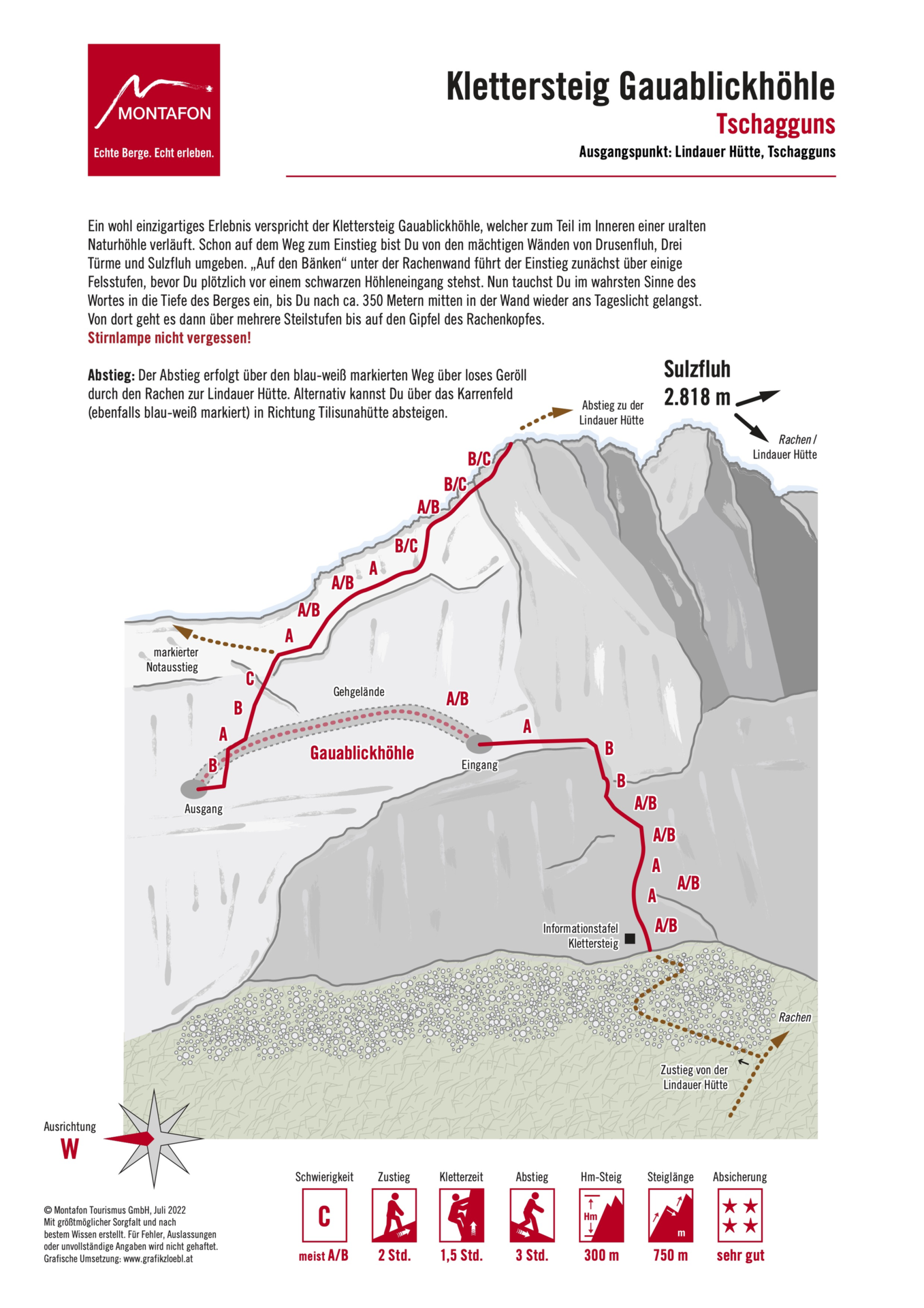Ein wohl einzigartiges Erlebnis verspricht der Klettersteig Gauablickhöhle, welcher zum Teil im Inneren einer uralten Naturhöhle verläuft. Schon auf dem Weg zum Einstieg bist Du von den mächtigen Wänden von Drusenfluh, Drei Türme und Sulzfluh umgeben. „Auf den Bänken“ unter der Rachenwand kletterst Du zunächst über einige Felsstufen, bevor Du plötzlich vor einem schwarzen Höhleneingang stehst. Nun tauchst Du im wahrsten Sinne des Wortes in die Tiefe des Berges ein, bist Du nach ca. 350 Metern mitten in der Wand wieder ans Tageslicht gelangst. Von dort geht es dann über mehrere Steilstufen bis auf den Gipfel des Rachenkopfes.