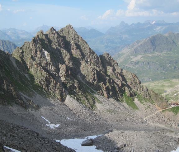Zustieg: Direkt hinter der Saarbrücker Hütte erhebt sich die Felsformation des Kleinlitzner. Der Einstieg zum Klettersteig befindet sich ca. 350 Meter südlich der Hütte und ist leicht erreichbar.