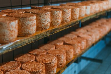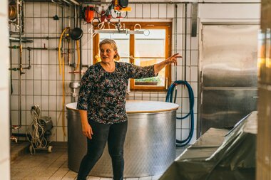 Andrea lacht: „Sura Kees kann man nicht lernen, nur erfahren. Man braucht jahrelange Erfahrung damit der Käse so gut wird – in einer Schule lernt man das nicht.“ Zum Abschluss essen wir unter dem Sonnenschirm noch Sura Kees auf Brot und Erdbeer-Buttermilch zum Probieren - einfach köstlich.