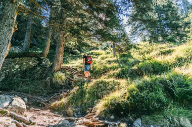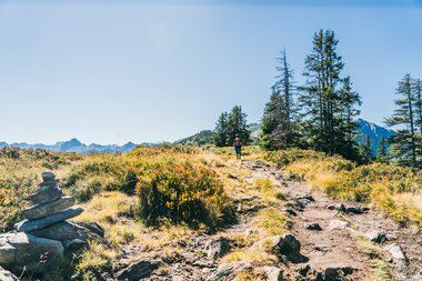 Schon nach ein paar Metern lassen wir die kleine Siedlung Garfrescha hinter uns und sind ganz in der Natur. Der Weg führt erstmal bergauf durch einen kleinen Wald, vorbei an Blaubeerfeldern. Da es schon ordentlich warm ist, kommen wir hier ganz schön ins Schwitzen. Aber die gut 300 Höhenmeter sind schnell geschafft und von nun an geht es relativ flach weiter. Gut einen Kilometer vor dem Gipfel des Gantakopfes lässt man auch den Wald hinter sich und man hat schon eine super Aussicht auf die umliegenden Berge und Täler. Hin und wieder können wir schon unser Ziel, die Alpe Nova, unten im Tal sehen. Vom Gipfel des Gantakopfes aus hat man dann eine traumhafte Aussicht ins Montafon! Wir machen hier erstmal eine ausgiebige Pause und genießen die Aussicht.