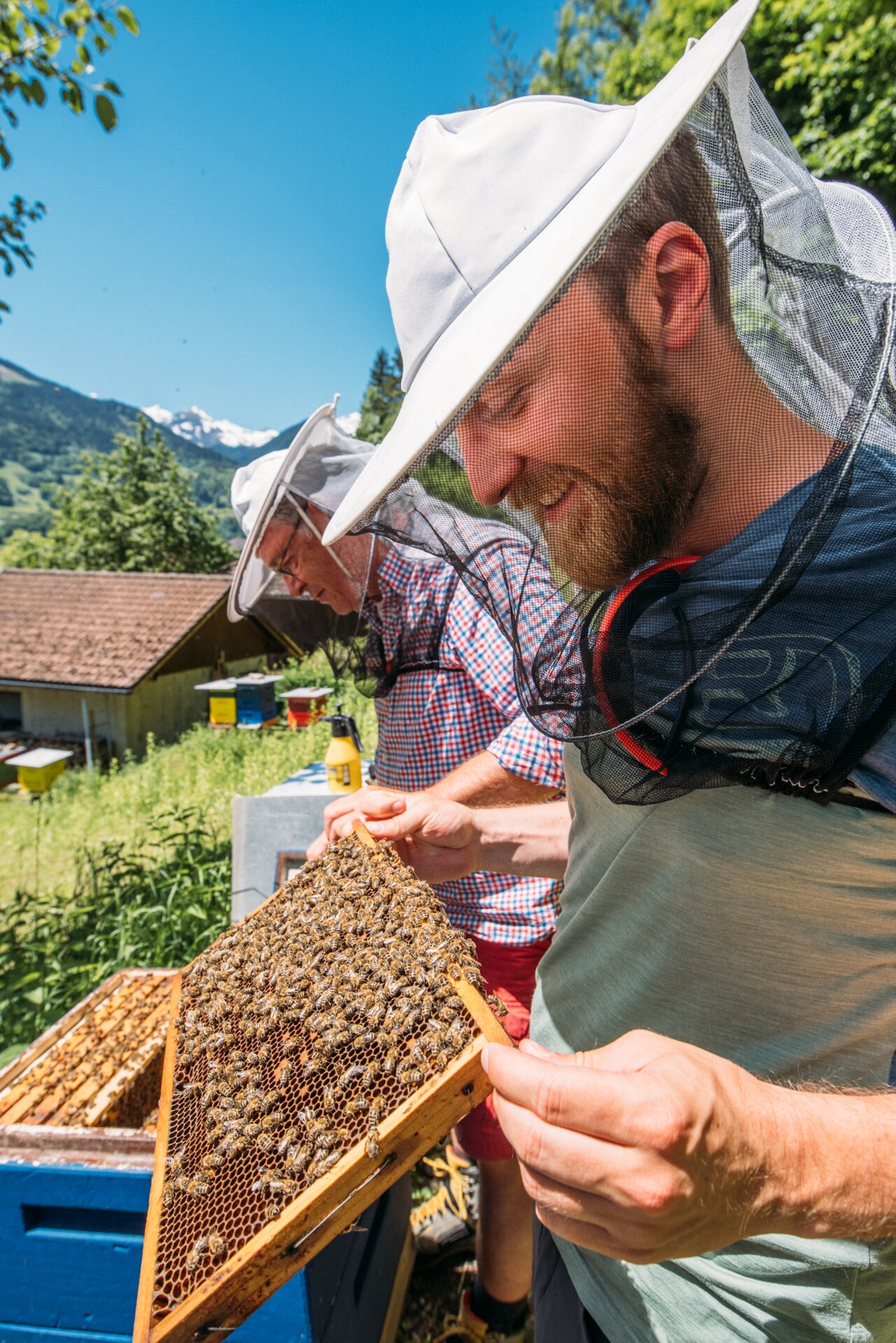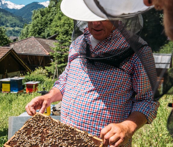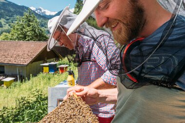 Am Ende der Wanderung kommen wir in Schruns an. Dort stehen Harrys Bienenstöcke. Erst erklärt er uns, wie Bienen gezüchtet werden und wie der Imker zu seinem Honig kommt. Wir waren ganz überrascht – ein Bienenstock beherbergt etwa 50.000 Bienen und jede Biene fliegt etwa drei Mal täglich los, um Nektar und Pollen zu sammeln. Wir wollen uns die Honigbienen aus der Nähe ansehen und ziehen uns einen Imkerhut über. Wir schauen in die Bienenstöcke und in einer Wabe entdecken wir sogar eine Bienenkönigin. Während die Arbeiterbienen nur etwa sechs Wochen leben, kann eine Königin etwa fünf Jahre alt werden. Dabei legt sie über den Sommer etwa 1.500 Eier pro Tag und verbraucht dabei unglaublich viel Energie. Harry ist Imker aus Leidenschaft und das merkt man auch. Wir haben viele Fragen und er beantwortet sie alle, bevor die Imkerwanderung zu Ende geht.
