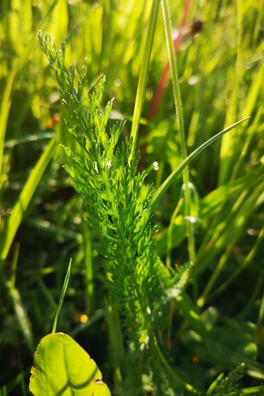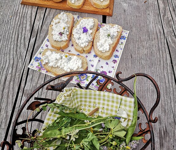 Ich setze meine Wanderung zum Fritzensee fort. Wunderschön eingebettet in die Maisäßlandschaft ist der Bergsee zu jeder Jahreszeit faszinierend. Er ist wertvolles Zuhause von Fröschen, Libellen und Molchen, die ich als Naturführerin liebend gern beobachte. Ich setze mich an die Hauswand eines Maisäß und packe meine Jause aus: frischer Topfen von unserem Bauernhof und selbstgebackenes Brot, das ich nun noch verfeinern will. Suchend nach einem passenden Bergkraut blicke ich zu meinen Füßen. Hurra, hier wächst die Schafgarbe. Sie eignet sich bestens für Kräutertopfen, Kräuterbutter, Salat und Suppen. Auch getrocknet als Kräutersalz und Tee findet sie Verwendung. Sie ist wohltuend bei Magen-Darm-Beschwerden und wirkt entzündungshemmend und entkrampfend. Verziert wird mein Kräuterbrötchen noch mit einer Gänseblume.
