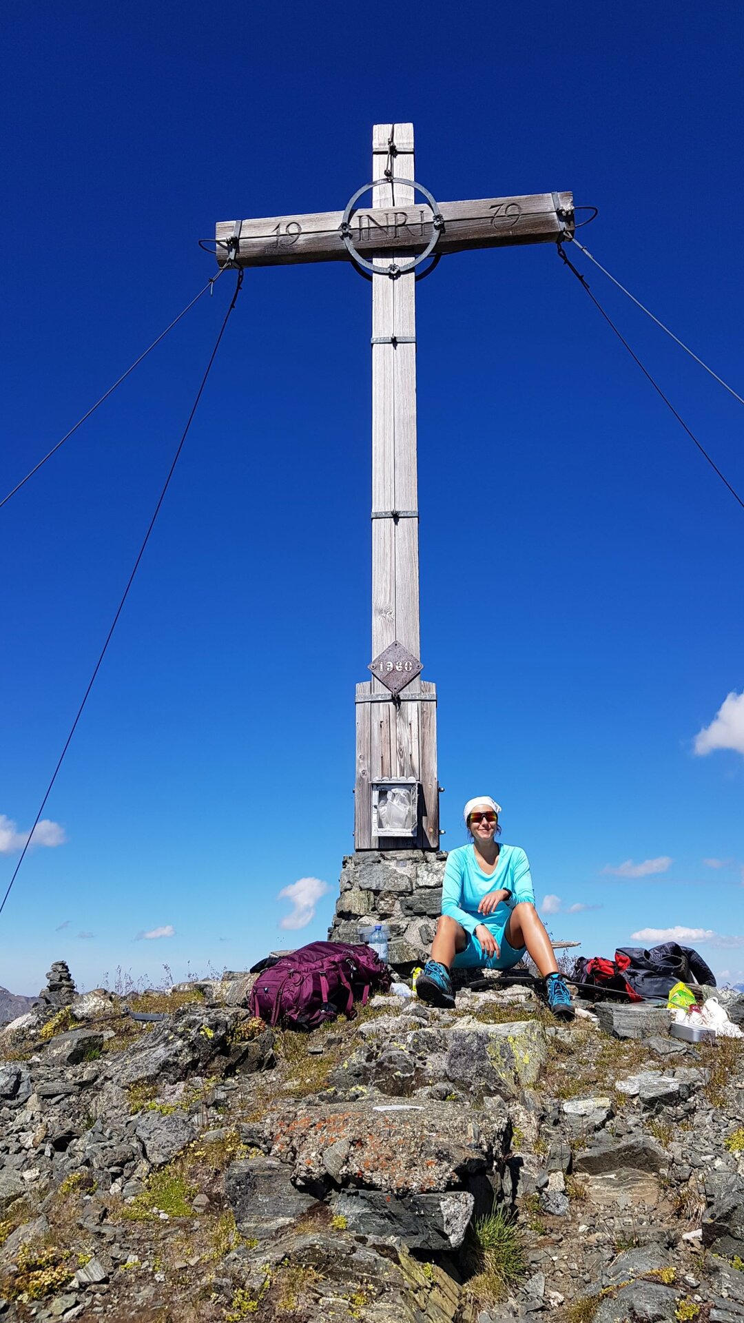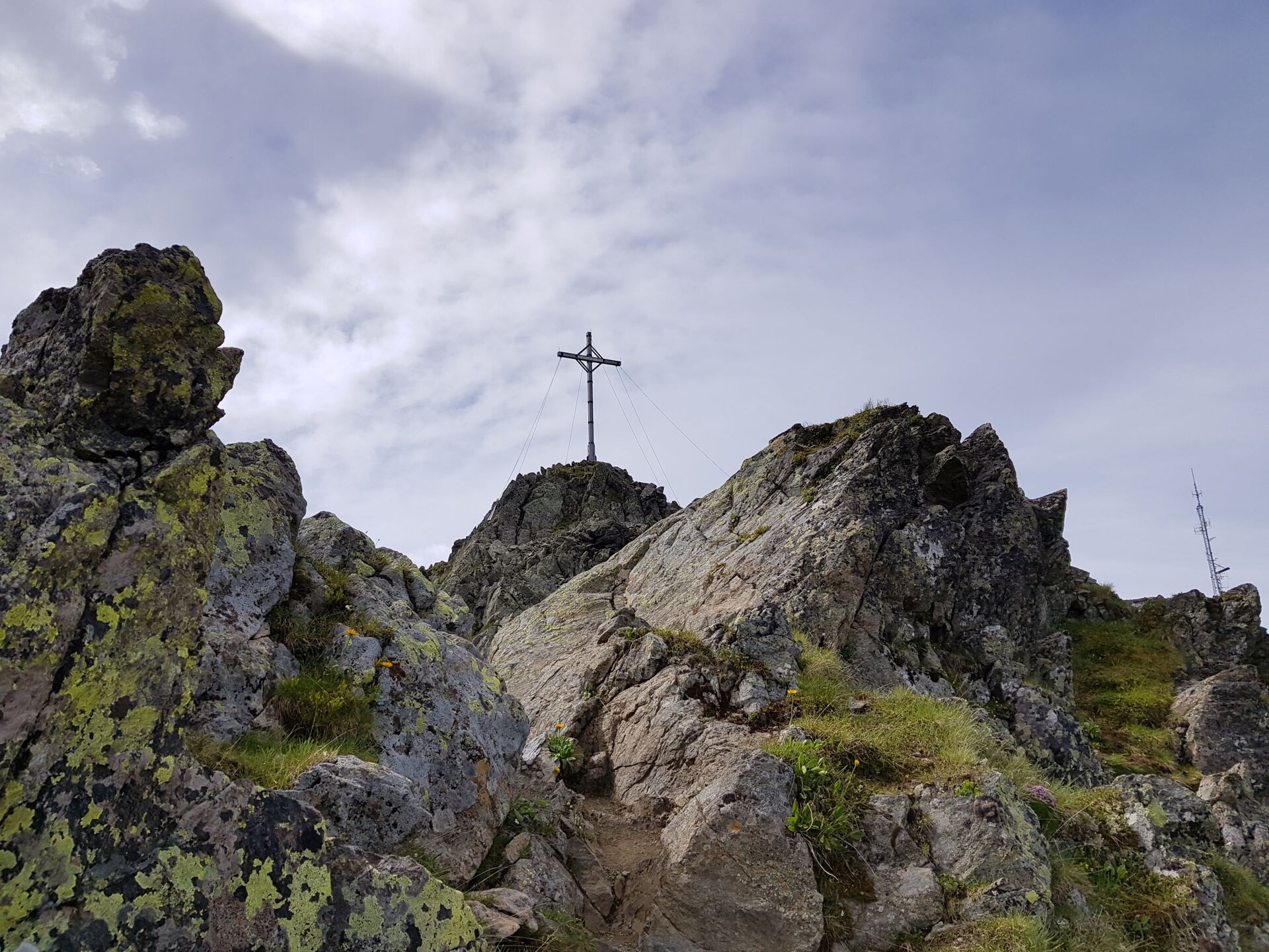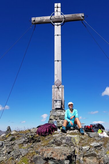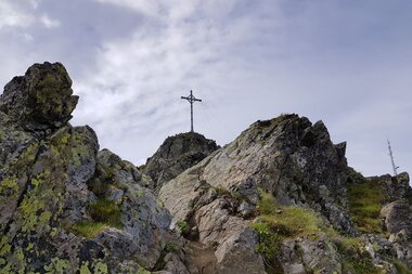 Wir ziehen bald weiter und nehmen den blau-weiß markierten Pfad zum Kreuzjoch Gipfel auf 2.395 Meter.