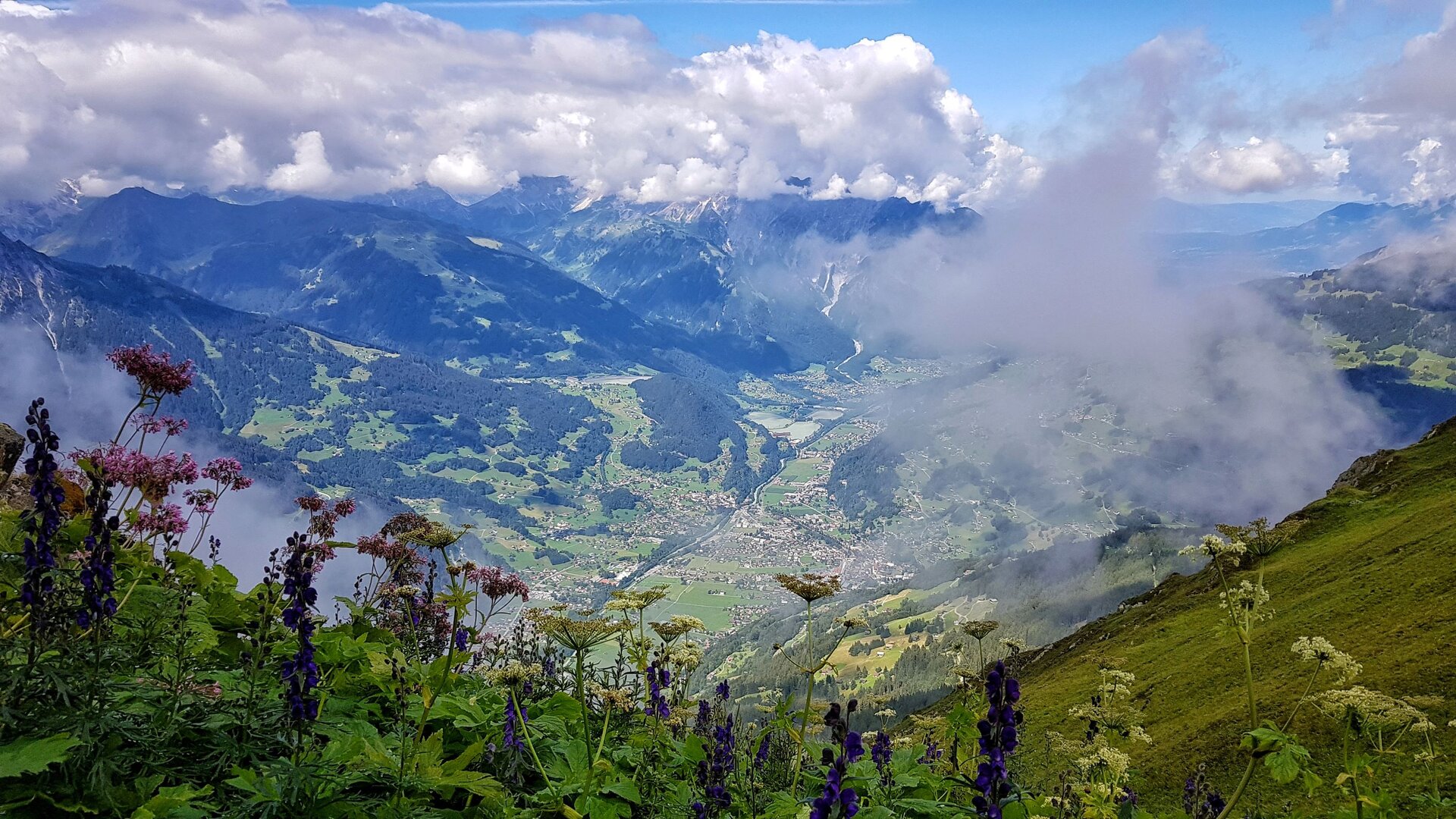 Mit vollem Elan starten wir unsere Tour auf einem schmalen felsigen Grat Richtung Valschavieler Maderer. Entlang eines Felsbandes zur Linken, wo wir immer wieder Blicke ins Seetal werfen können und zur Rechten steil abfallend mit großartiger Aussicht über die Gemeinden unter uns, erreichen wir nach ca. 15 Minuten Gehzeit die Wormser Hütte. Einige Gäste rüsten sich auch schon zum Aufbruch diverser Touren oder sitzen noch gemütlich beim Frühstück.