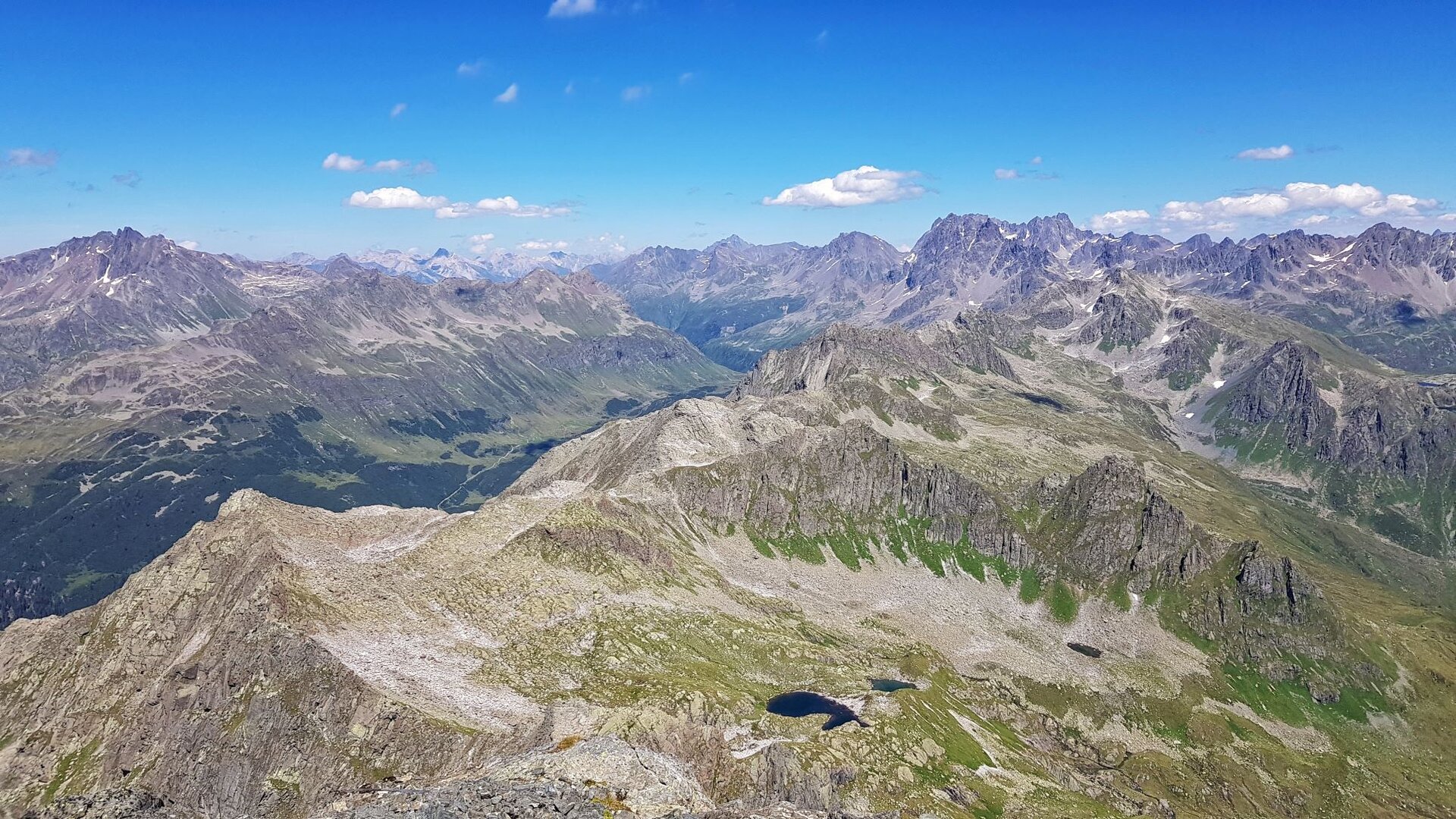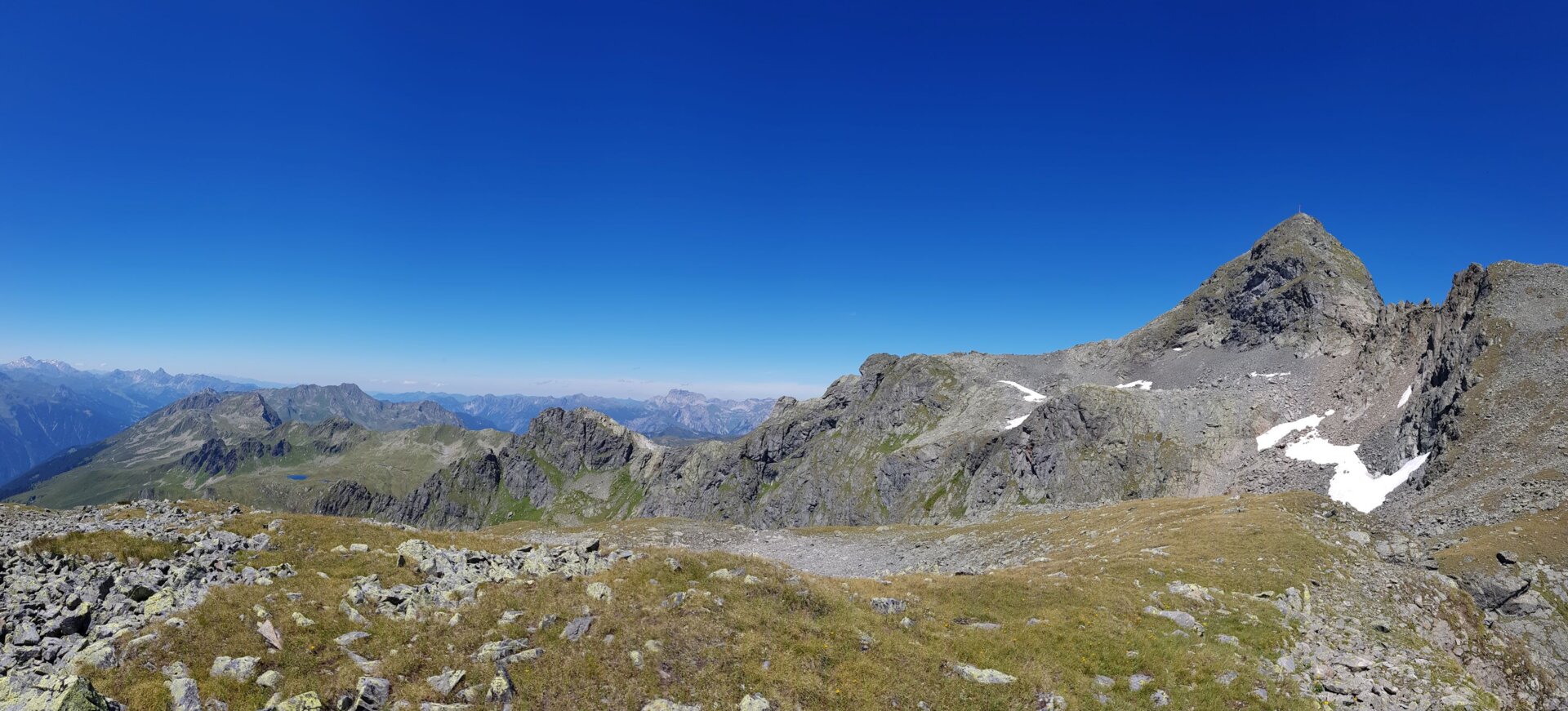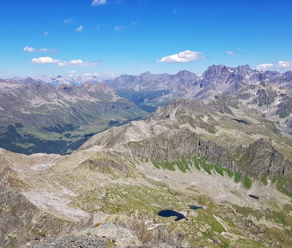 Das Silvrettagebirge mit dem höchsten Berg Vorarlbergs, dem Piz Buin, erstreckt sich imposant vor uns. Das Lechquellgebirge ist von hier aus ebenfalls gut zu sehen, sowie fast das gesamte Ländle. Durch seine isolierten Lage, versperrt uns kein anderer Berg die Sicht, lediglich das Wetter könnte uns hier ein Schnippchen schlagen.