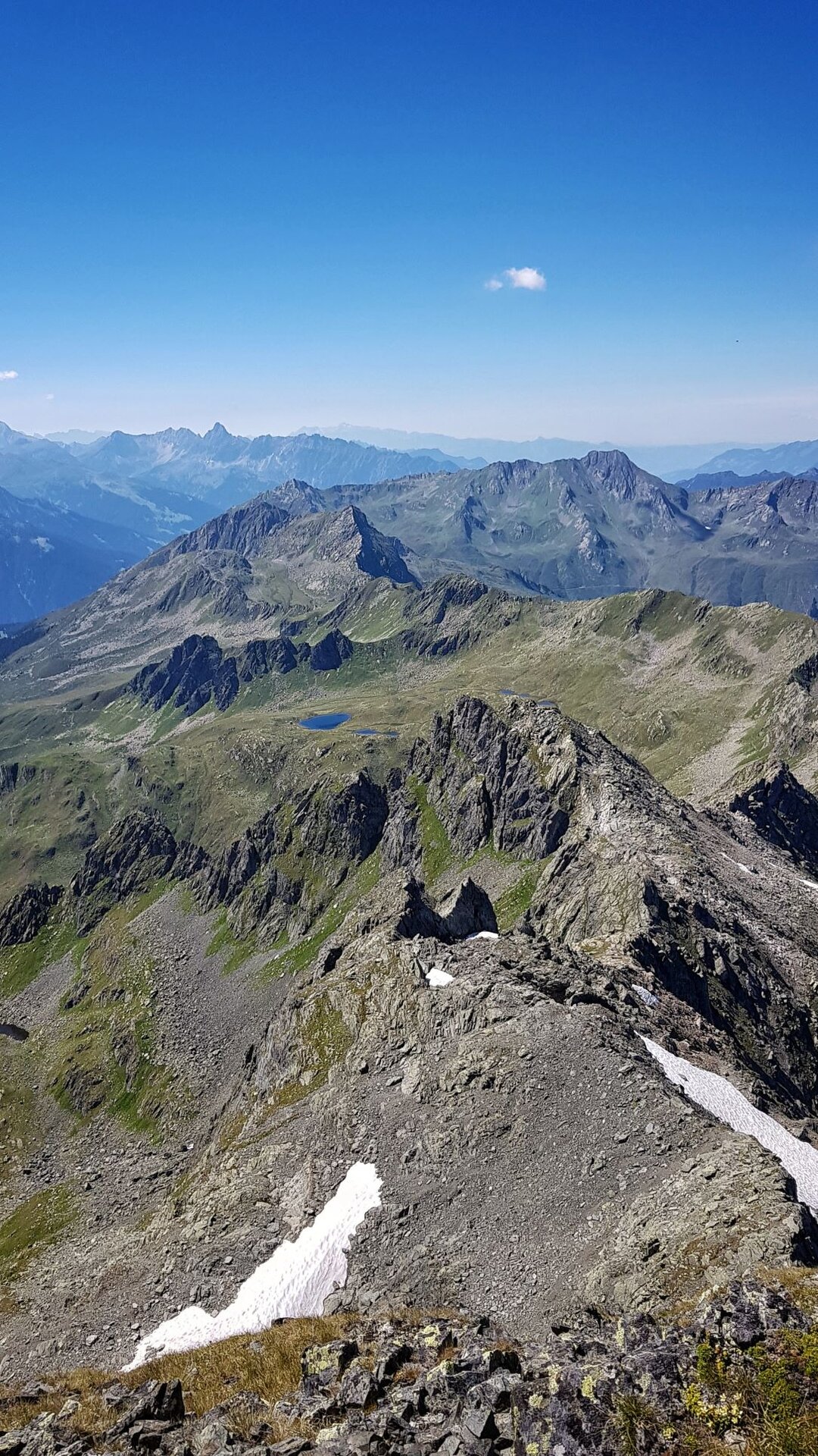 Viele Wanderer trifft man auf diesem Weg nicht, ideal für Ruhesuchende. Nach einer kurzen Stärkung treten wir die letzte Etappe zum Gipfel an. Ein schmaler alpiner Pfad führt uns zu einem trümmergefülltem Hochkar hinauf, auf dem stellenweise noch ein Schneefeld liegt, die Querung stellt jedoch kein Problem dar.