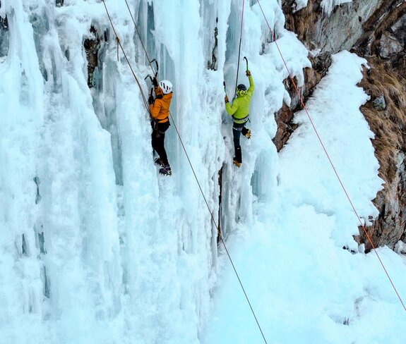 Aber Schritt für Schritt und Schlag für Schlag arbeiteten wir uns an der Eiswand nach oben. Es gab schwerere und leichtere Routen. Bereits bei zweitem Anlauf schafften wir es, die Wand bis nach oben zu klettern und wurden anschließend wieder angeseilt. Puh, war das anstrengend. Aber es machte wahnsinnig viel Spaß. Unsere kleine Gruppe feuerte sich gegenseitig an, Beat gab uns wertvolle Technik-Tipps und wir wechselten uns beim Sichern und Klettern immer wieder ab.