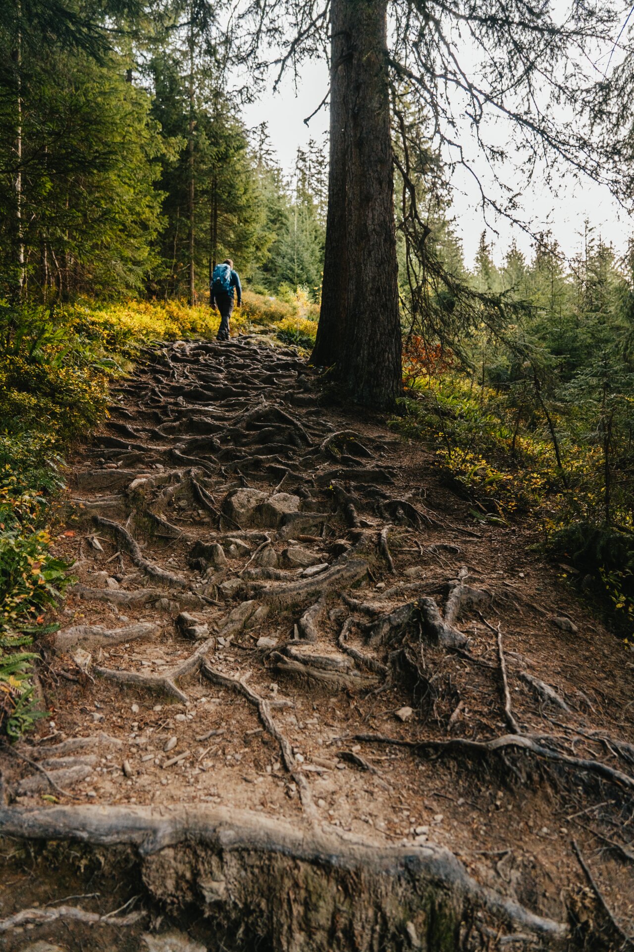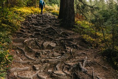 Von der Bergstation aus geht es gleich auf einem steilen Pfad bergauf. Wir wandern durch den stillen Wald, nur das Hämmern eines Spechts und das Summen der vielen Insekten in den Baumwipfeln ist zu hören.