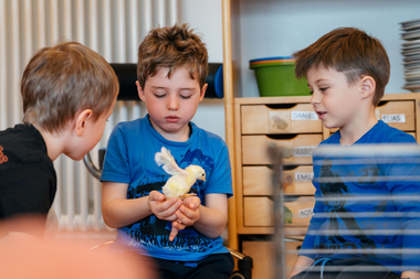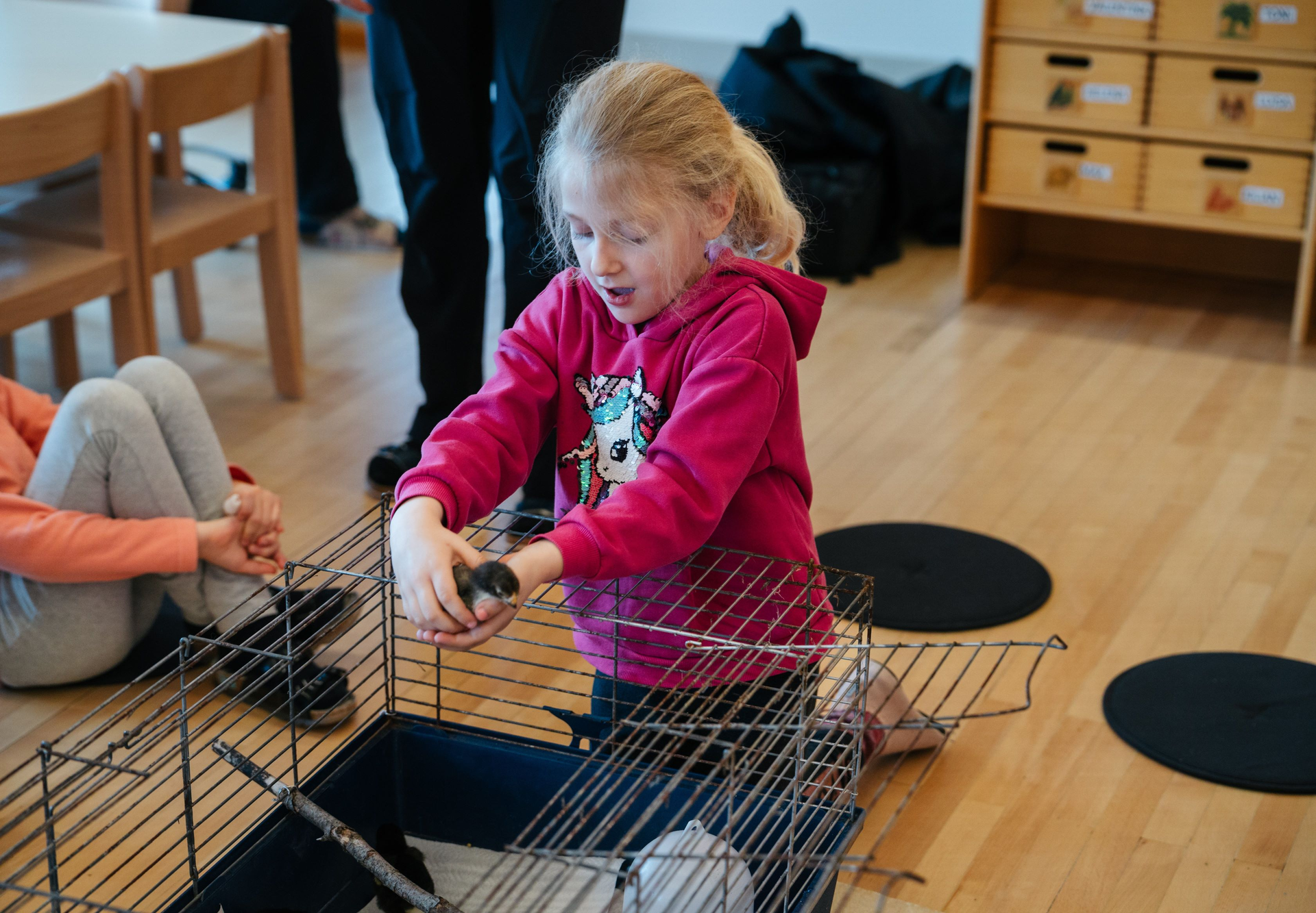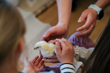 Flauschi war das erste Küken, das sich aus dem Ei kämpfte. Zusammen mit der Kindergartenpädagogin Tiada, säuberten die Kinder den Käfig und lernten dabei nicht nur praktische Fähigkeiten, sondern auch wichtige Werte wie Mitgefühl, Fürsorge und Zusammenarbeit. Fabio: „Du musst mit Gefühl…“ Klara und Toni entwischten die kleinen, flinken Tierchen. Gemeinsam und mit Bedacht fingen sie die Küken wieder ein.