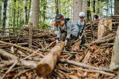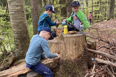 „Es ist für die Kinder immer etwas ganz Besonderes, Zeit in dieser natürlichen Umgebung zu verbringen und zu entdecken, was alles möglich ist", erklärte Bernhard. So wurden Äste gesammelt, die zum Bauen eines Zauns dienten, aber auch kreative Ideen entstanden in den Köpfen der Mädchen und Buben, wie zum Beispiel ein Flatsceen TV aus Ästen. Der Tannenzapfen diente als Fernbedienung.