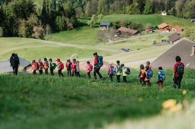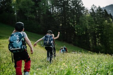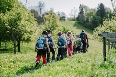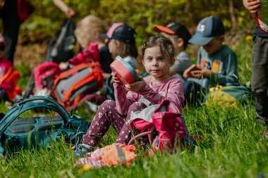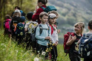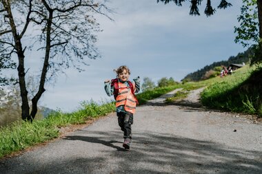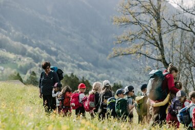 Zusammen mit ihren Kindergartenpädagoginnen Christine, Evi und Tiada wanderten die Kinder voller Stolz weiter auf dem Weg, der sie zum besagten Wald führte, vorbei an einer sogenannten „Magerwiese“. „Eine Magerwiese wird höchstens zwei Mal im Jahr gemäht. Infolgedessen entstehen artenreiche Wiesen. Die bunte Mischung aus Blumen, Gräsern und Kräutern bietet einen idealen Lebensraum für Insekten aller Art", erklärte Christine.