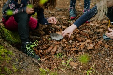 Auch Feuerschalen entstanden und Spiegeleier aus Tannenzapfen wurden gebraten. „Heute gibt es Spiegeleier, schau wie viele Tannenzapfen wir dafür schon gesammelt haben", zeigte Theresa mit einem strahlenden Gesicht.