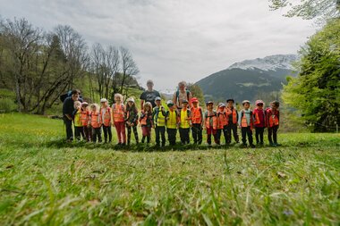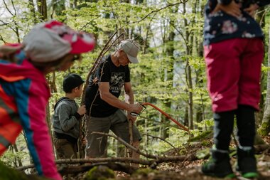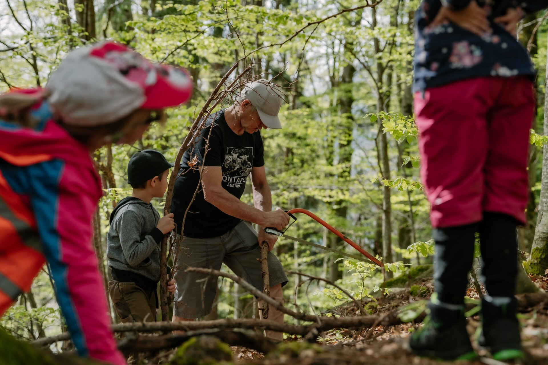 Als die Kinder im Wald ankamen, wurden sie bereits von Bernhard erwartet. Zusammen mit seiner Frau Christine, der Kindergartenpädagogin im Kindergarten Bartholomäberg, ermöglicht er den Kindern, die Natur auf eine besondere Art und Weise zu erleben. Durch ihren Wald, den sie dem Kindergarten mehrmals im Jahr zur Verfügung stellen, lernen die Kleinen nicht nur mit natürlichen Spielzeugen zu spielen, sondern auch den Respekt vor der Natur zu entwickeln.