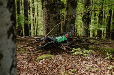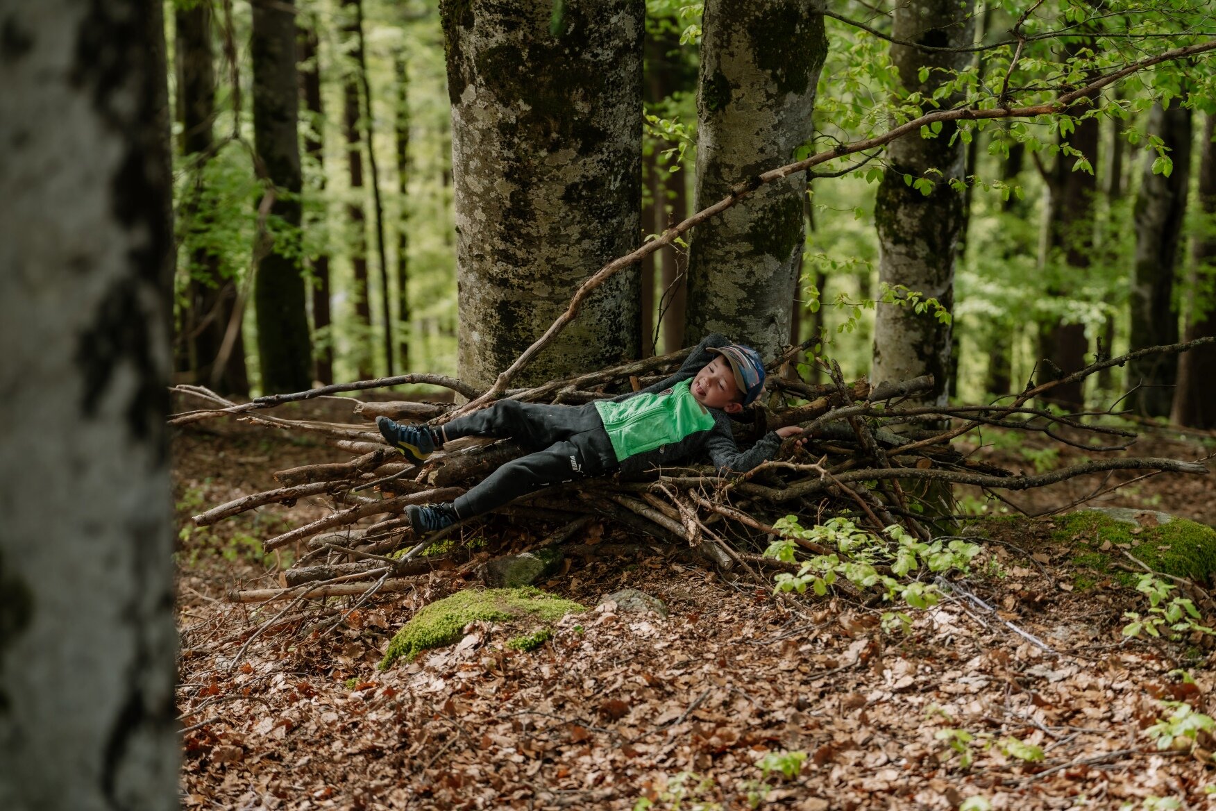Kilian baute sich eine Liege aus Ästen, darauf etwas Moos für die Bequemlichkeit und schon machte er sein besagtes Nickerchen.