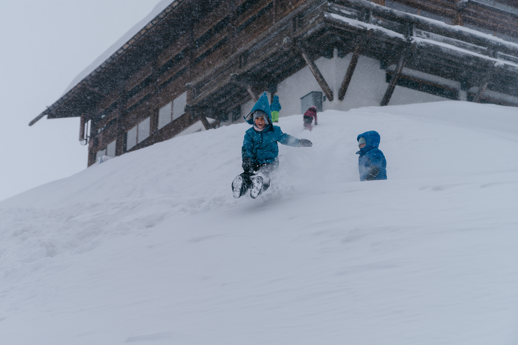 Leopold rutschte vergnügt den Hang hinunter. „Der Wind ist so kalt, da gefriert einem ja das Blut in den Lippen“ rief er. Und schon war er wieder weg und rutschte erneut. Gut ausgestattet mit Skibrille, machte Romeo einen Schneeengel in den frische Pulverschnee. Auch Laurin und Nikolai lachten ausgelassen, als sie den kleinen Schneehügel hinunterhüpften. Sie fühlten sich frei und leicht, als sie den Schnee unter sich sprüren konnten. Mit roten Wangen und strahlenden Augen kletterten sie jedes Mal wieder hoch, um erneut den Hügel hinunterzusausen.