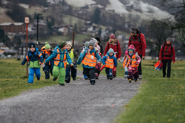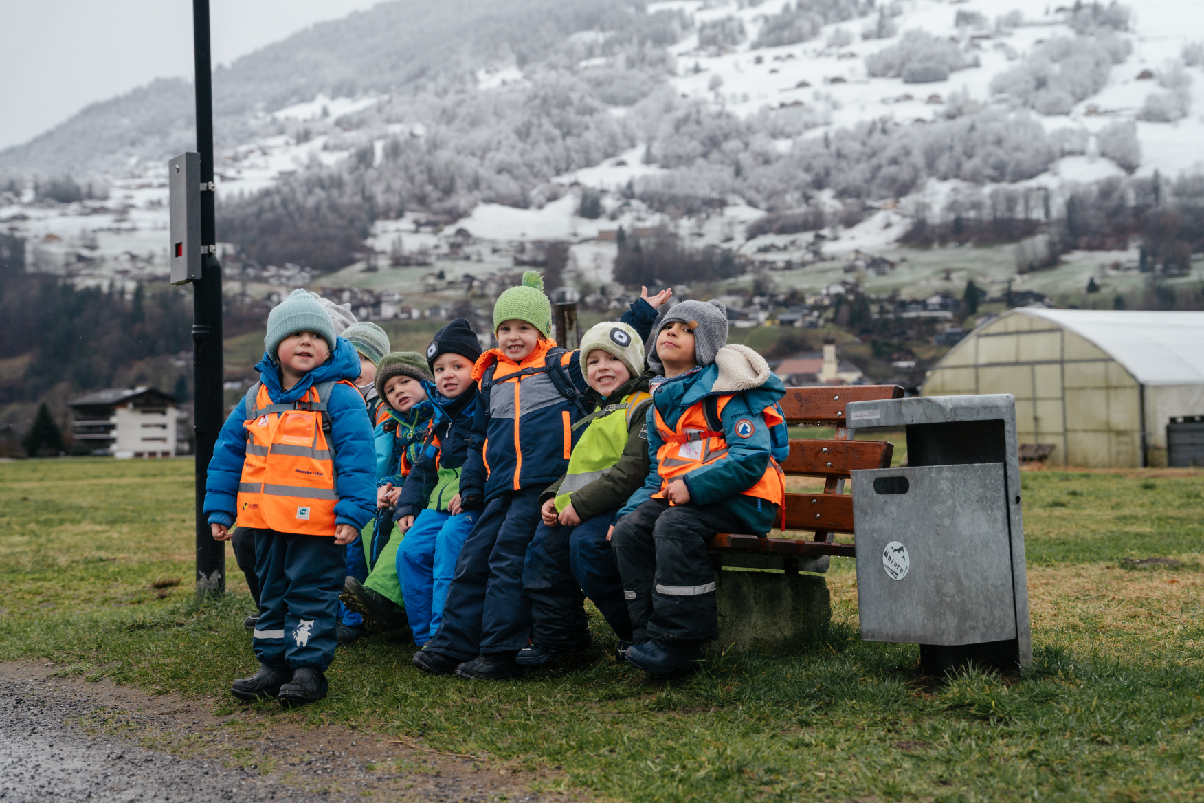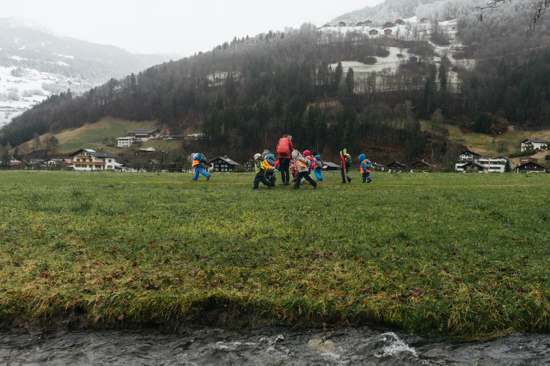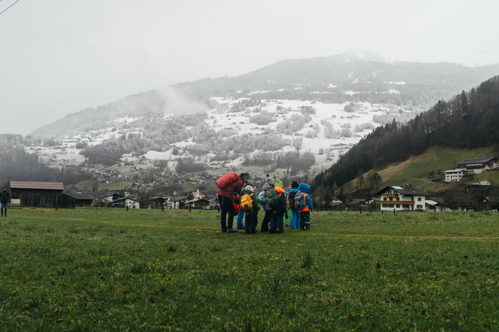 Da der Bus zurück nach Bartholomäberg noch auf sich warten ließ, wurde schnell umentschieden. Zu Fuß stapften die Kinder übers „Feld" (den Feldweg in Schruns entlang) zur nächsten Bushaltestelle. Auch dieser Weg hielt kleine Abenteuer bereit. Sie waren fasziniert, als sie von hier aus auf den Bartholomäberg sahen. Felix: „Da oben ist mein Kindergarten und er steht im Schnee." In Schruns war der Schnee bereits geschmolzen. So konnten die Kinder über grüne Wiesen rennen.