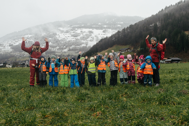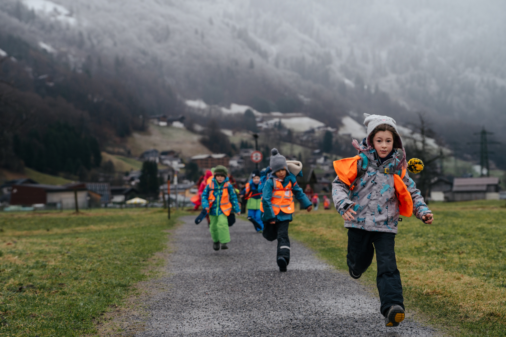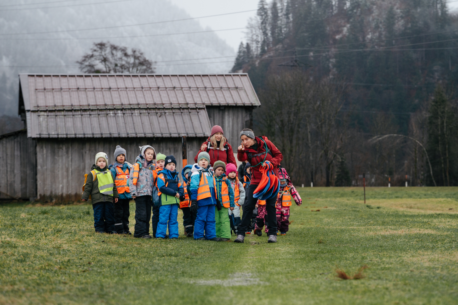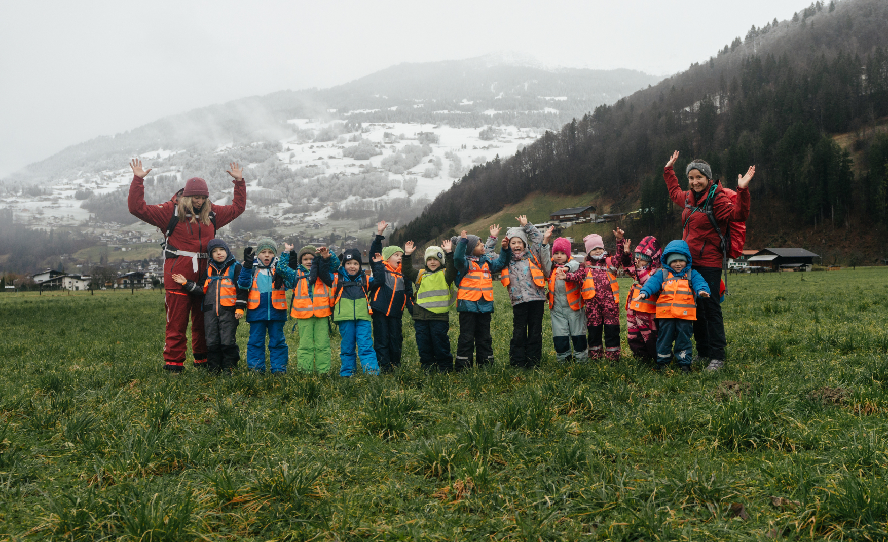 Da der Bus zurück nach Bartholomäberg noch auf sich warten ließ, wurde schnell umentschieden. Zu Fuß stapften die Kinder übers „Feld" (den Feldweg in Schruns entlang) zur nächsten Bushaltestelle. Auch dieser Weg hielt kleine Abenteuer bereit. Sie waren fasziniert, als sie von hier aus auf den Bartholomäberg sahen. Felix: „Da oben ist mein Kindergarten und er steht im Schnee." In Schruns war der Schnee bereits geschmolzen. So konnten die Kinder über grüne Wiesen rennen.