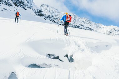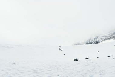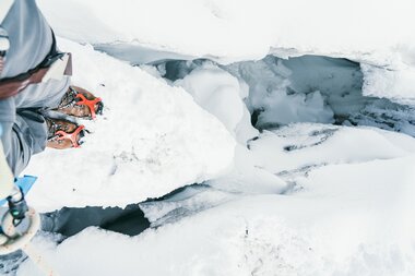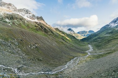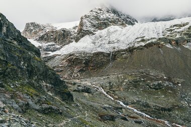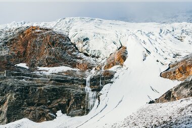 Über den Ochsentaler Gletscher geht es wieder zurück zur Wiesbadener Hütte. Kurz vor dem Ende der Wanderung wartet noch eine kleine Überraschung auf uns. Gemeinsam mit Hanno schauen wir uns das imposante Gletschertor von innen an. Wir fühlen uns wie in eine andere Welt versetzt. Wir hören das laute Rauschen des Wassers und die Wände leuchten in türkis und eisblau. Wir können uns gar nicht satt sehen, so schön ist es. Kaum zu glauben, dass ein unscheinbares Loch so schön sein kann. An der Wiesbadener Hütte gönnen wir uns noch einen Kaiserschmarren und stoßen auf das Gipfelerlebnis an, bevor wir uns wieder an den Abstieg zur Bielerhöhe machen.