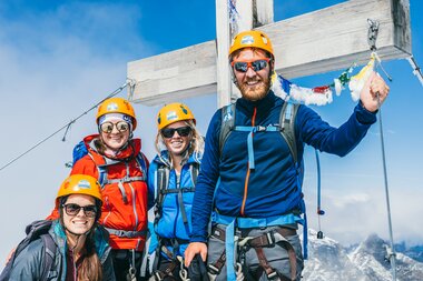 An der Buinlücke haben wir bereits 3 Stunden Aufstieg hinter uns und jetzt geht es an den letzten Teil des Aufstiegs. Wir ziehen uns unsere Handschuhe über, denn jetzt beginnt der Kletterteil der Tour. Am langen Seil arbeiten wir uns Stück für Stück bis zum Gipfel vor. Es ist anstrengend, aber wir meistern die Strecke dennoch ganz zufriedenstellend. Endlich ist das Gipfelkreuz in Sicht! Endlich geschafft und was für ein schöner Anblick uns oben erwartet. Wir kommen genau richtig, bevor sich der Gipfel in Wolken hüllt. Die Aussicht auf die umliegenden Berge und den Silvrettasee ist traumhaft. Wir machen eine kurze Pause, essen Schokolade und genießen unseren Gipfelmoment. Dann geht es auch wieder hinunter.