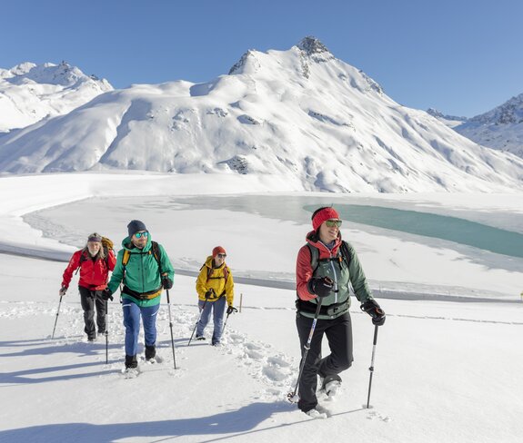 Immer wieder eröffnen sich uns atemberaubende Blicke auf das vor uns liegende Gebirgsmassiv. Ein Blick über die rechte Schulter offenbart uns den höchsten Berg Vorarlbergs, der Piz Buin. Aus der Ferne, ausgehend von den hohen Gipfeln der Silvretta-Bielerhöhe, kommen zahlreiche Fahrspuren zum Vorschein, die meist von Tourengeherinnen und Tourengehern hinterlassen werden. Catharina klärt uns bei den Trinkpausen immer wieder über die Gegend auf und was wir noch so unternehmen können. Wir sind nun mehr als zwei Stunden im Gelände unterwegs als wir über eine Kuppe gehend auf den glasklaren Silvrettasee herabblicken. Die Sonne hat bei wolkenlosem Himmel heute freie Bahn, weshalb der See die Konturen der Berge und den Kontrast zwischen Schnee und Gestein besonders schön zur Geltung bringt. Fantastisch! Das Endziel unserer Tour ist damit erreicht.