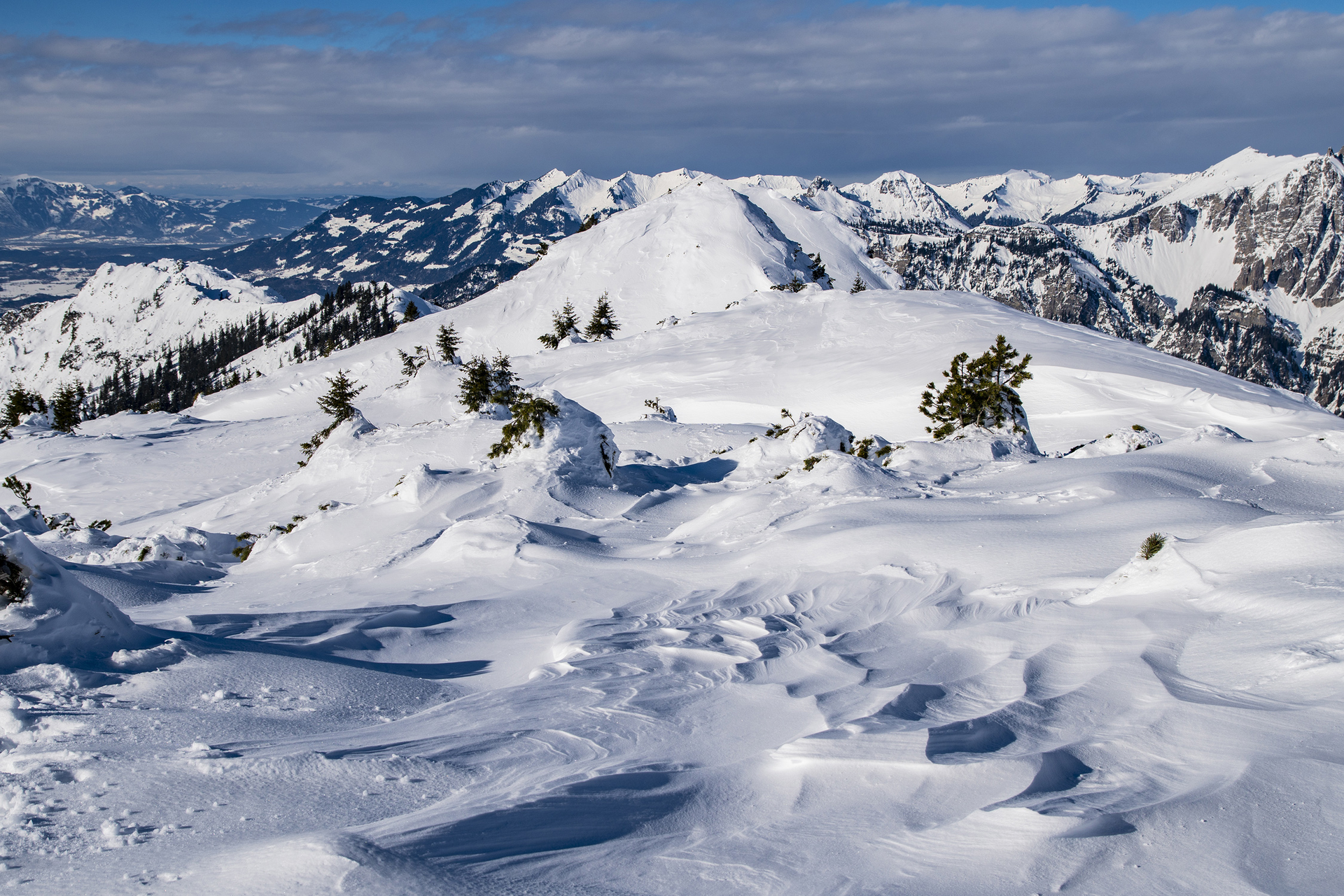 Noch hatten wir aber ein paar Höhenmeter vor uns, doch die grandiose Winterlandschaft mit tiefverschneiten Bäumen machte uns den Aufstieg leichter. Endlich oben angekommen, hat es uns fast vom Gipfel geblasen. Der Wind war heute übermäßig stark. Aber nichtsdestotrotz genossen wir den atemberaubenden Panoramablick auf die rundumliegenden Berge.