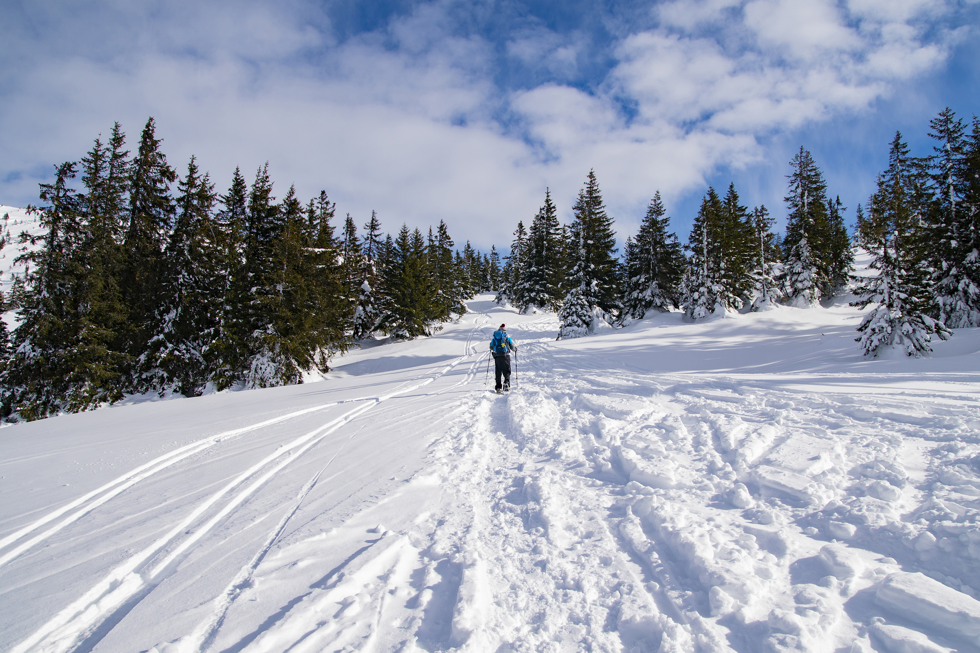 Dann ging es endlich in den Schnee. Die ersten Schritte einer Tour im Tiefschnee sind immer wieder ein voller Genuss. Es ging durch den Wald und teilweise über den präparierten Winterwanderweg zum Fritzensee, der sowohl im Winter als auch im Sommer immer wieder einen Besuch wert ist. Diesmal war er völlig zugefroren und mit Schnee bedeckt. Es ging dann wieder weiter abwechselnd durch kurze Waldstücke und Tiefschneehänge in der herrlich warmen Sonne. A propos: Ich hätte mich wohl doch eincremen sollen.