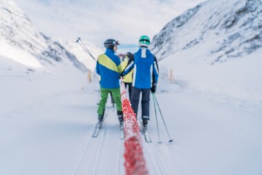 Am Treffpunkt angekommen, mussten wir keine fünf Minuten warten und schon konnten wir die Pistenraupe sehen. Der Fahrer der Pistenraupe muss noch kurz das Schleppseil befestigen und schon kann die Fahrt nach Galtür losgehen. Das Festhalten am Schleppseil ist zum Glück nicht sonderlich anstrengend, da die Strecke meistens flach ist oder ein leichtes Gefälle hat. Der Pistenbully zieht uns durch das wunderschön verschneite Kleinvermunttal. An den Berghängen können wir sogar einige Gämse entdecken, die sich ihren Weg durch den Schnee bahnen. Nach gut 15-minütiger Fahrt kommen wir dann im Skigebiet Galtür an.