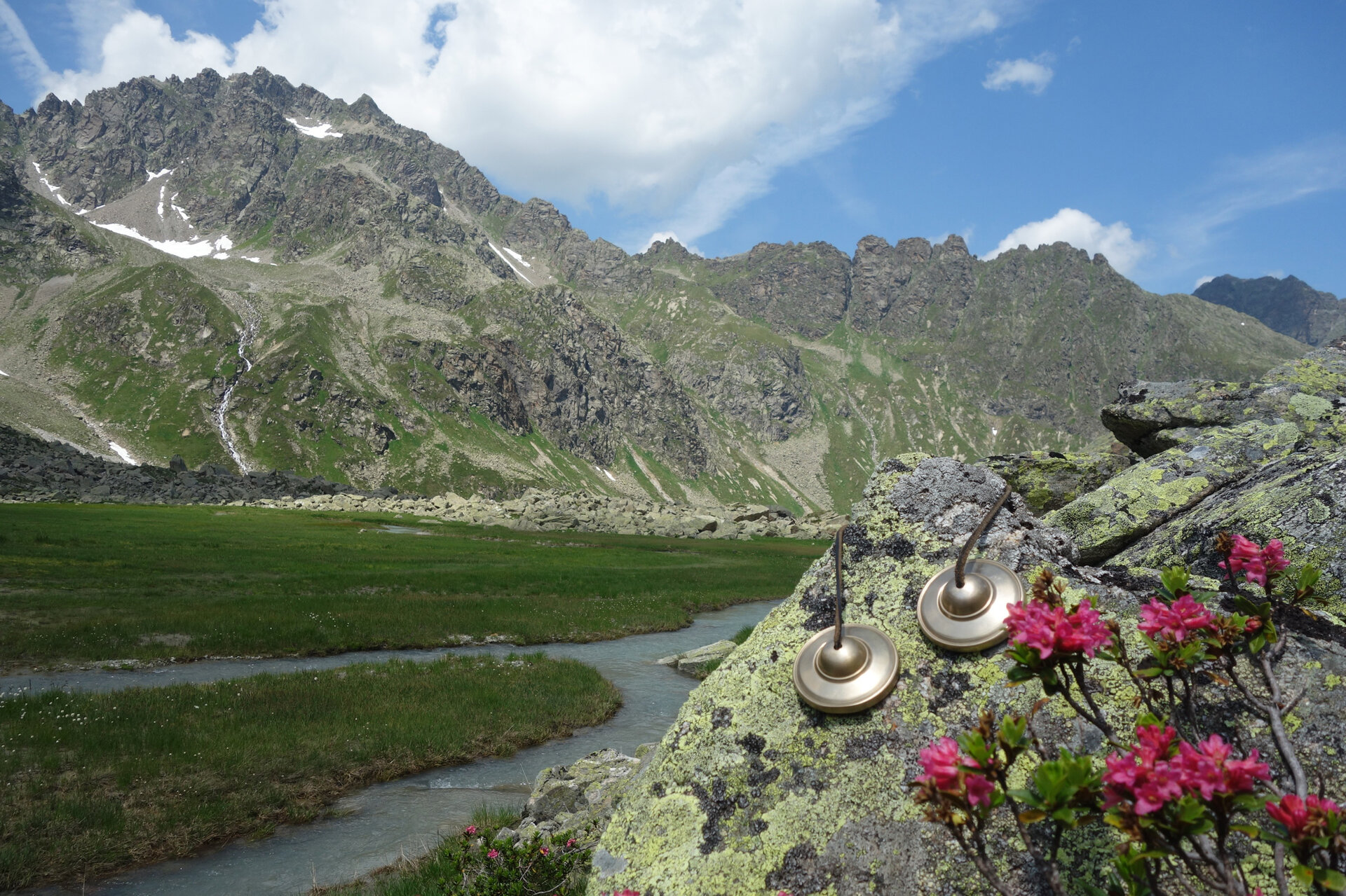 Auf der Ebene unterhalb der Saarbrücker Hütte gibt es einen wunderschönen Platz mit einem mäandernden Bächlein und einem großen Wollgrasfeld. Dort leite ich eine Naturmeditation an, bei der wir bewusst alle Elemente spüren und uns bei der Natur bedanken.