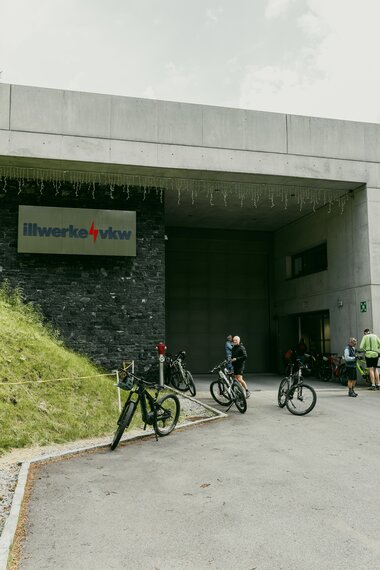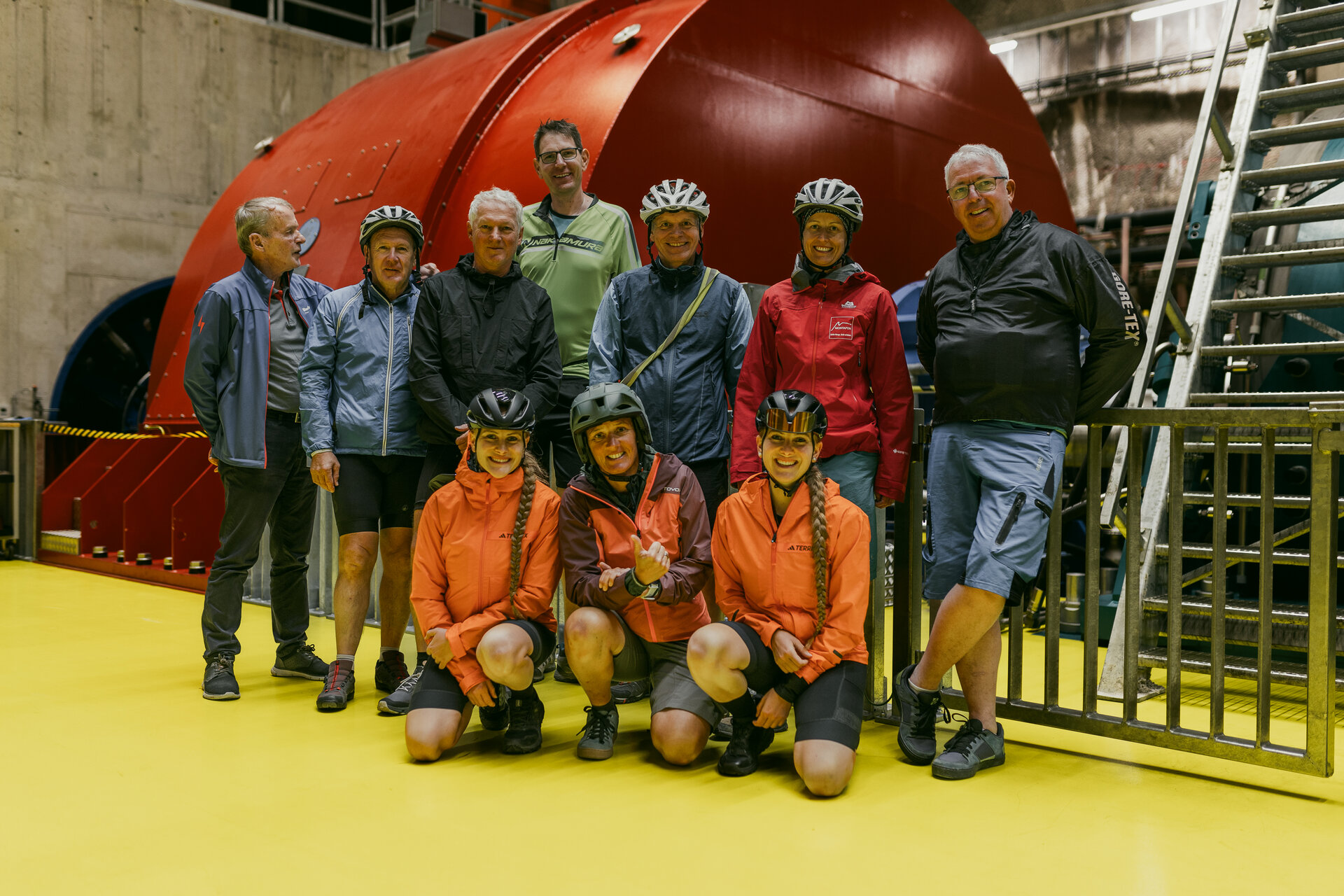 Und dann gings los zu DEM Highlight der Wasserkraftrunde: Der Besichtigung des Obervermuntwerk II Stollen. Ein Mitarbeiter der Vorarlberger Illwerke ist mit dem Auto vorausgefahren und wir mit den Rädern hinterher – und das 800 Meter weit in den Stollen hinein. Es war bitterkalt! Es ging immer leicht bergab und die Luftfeuchtigkeit war immens – jeder hat vor Kälte gezittert. Wir wussten durch den Film schon in etwa, was uns erwartet, aber in der Wirklichkeit war es einfach nochmal so viel beeindruckender, als wir es uns vorgestellt haben.