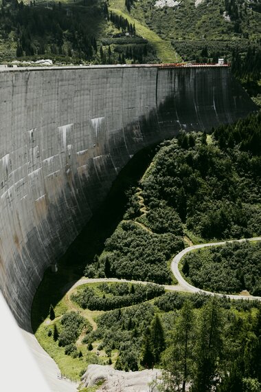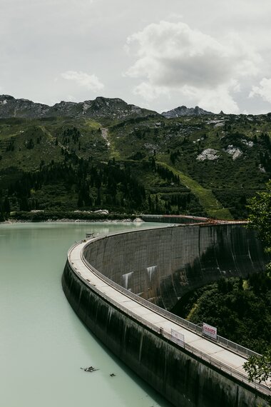 Schon von weitem sahen wir unseren dritten Stopp: der Stausee Kops.  Genauer gesagt, sahen wir die riesige Staumauer, die sich beeindruckend in der Ferne abzeichnete. Einerseits schien es so, als wäre es nur noch ein Katzensprung, andererseits war es noch ewig weit weg. Wieder einmal waren wir froh, dass wir nicht alles selber strampeln mussten. Als wir oben ankamen, staunten wir nicht schlecht über den tollen Ausblick. Der blaue Stausee, umrahmt von hohen Bergen. Teilweise blitze noch das ein oder andere Schneefeld heraus, was uns immer wieder daran erinnerte, in welcher Höhenlage wir uns befinden.