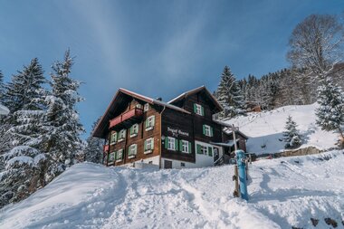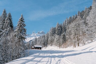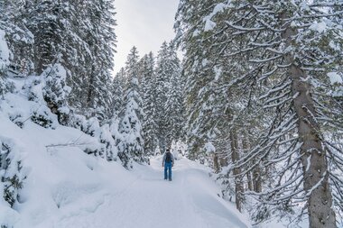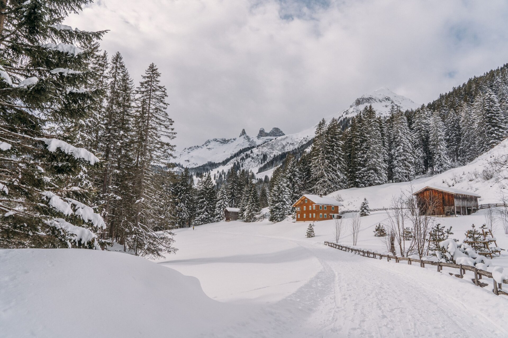 Wir starten unsere Tour in Latschau. Die Sonne scheint herrlich vom blauen Himmel und wir kommen uns vor, wie im Winterwunderland. Der Schnee liegt dick auf den Bäumen und die Luft ist frisch und klar. Ein Traumtag, um die etwa sieben Kilometer zur Lindauer Hütte zu wandern.