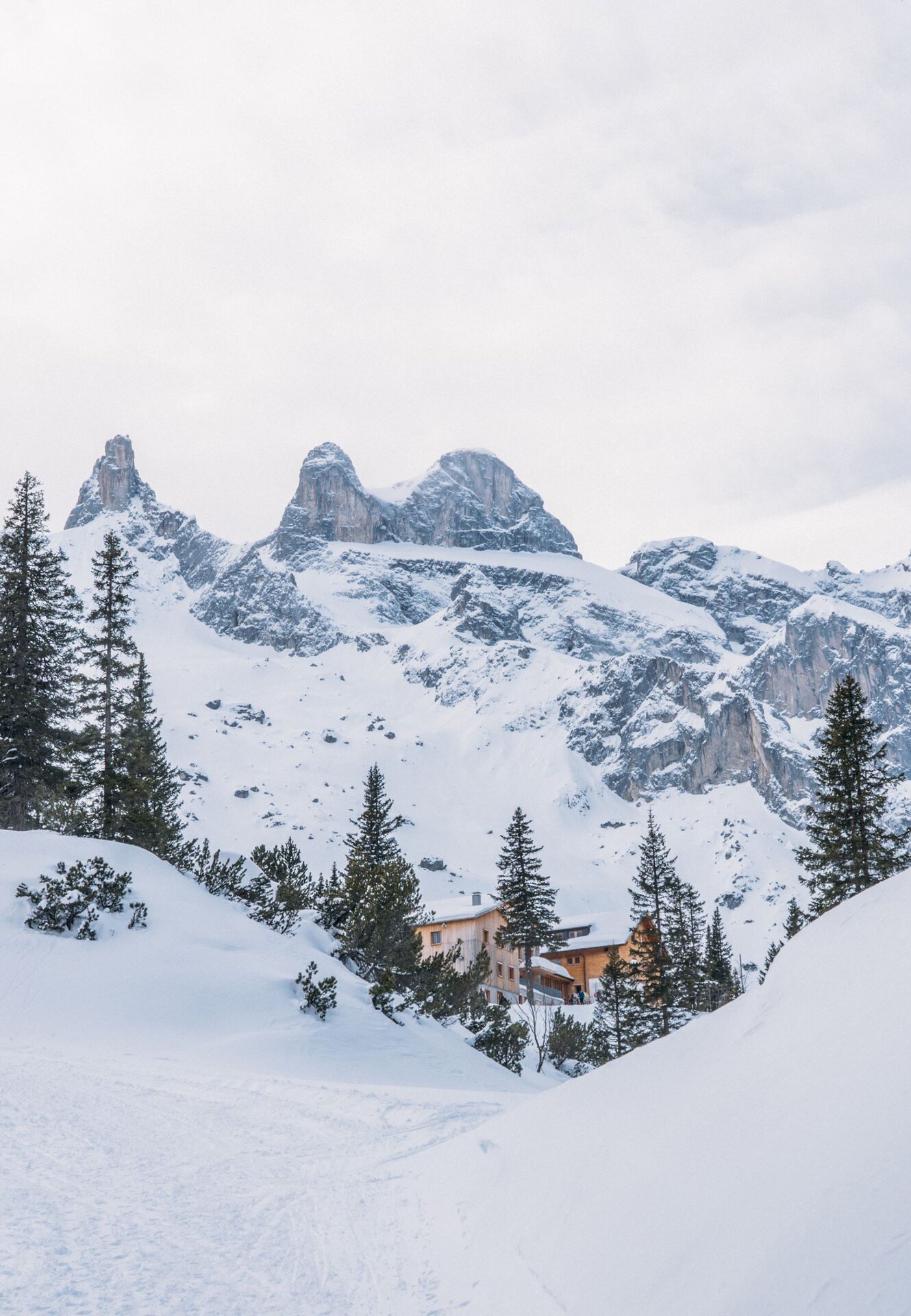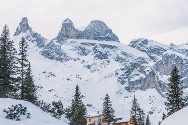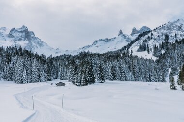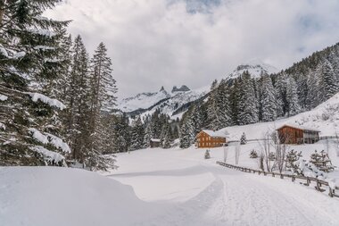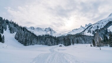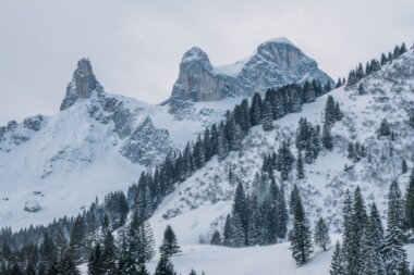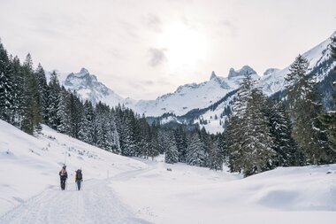 Der Weg ist gut präpariert und unsere Wanderschuhe reichen vollkommen aus. Extra Equipment ist also nicht notwendig, um diese Wanderung zu machen. Wir halten immer wieder an und genießen die Winterlandschaft und die Stille um uns herum. Am Ende des Tals sieht man schon die markanten „Drei Türme“. Man könnte meinen sie sind ganz nah dran, aber es dauert um die zwei Stunden bis wir endlich an der Lindauer Hütte angekommen sind. Unterwegs treffen wir immer wieder auf Skitourengeher und andere Wanderer. Die Stimmung ist gut, auch als das Wetter umschlägt und die Sonne sich bald hinter dicken Wolken versteckt.