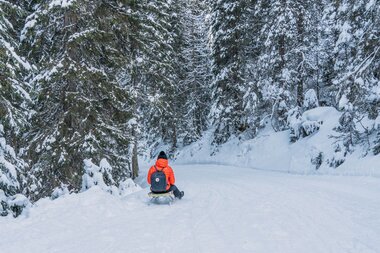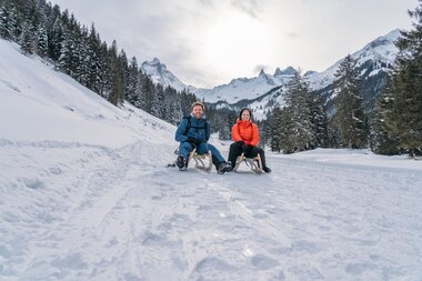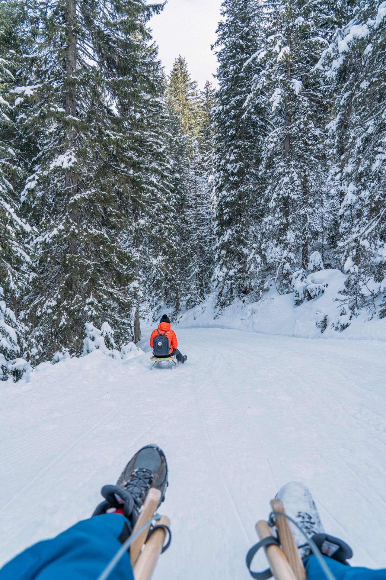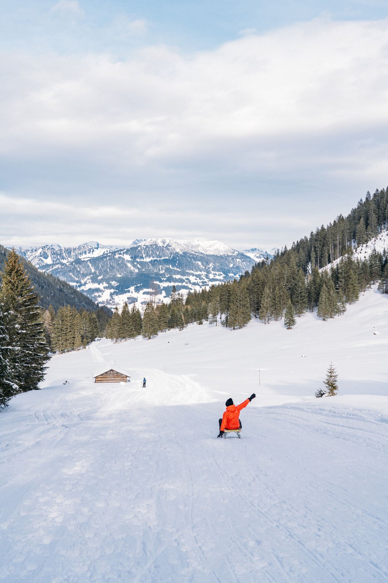 Nach der ausgiebigen Pause leihen wir uns zwei Rodel von der Lindauer Hütte und rodeln das gesamte Gauertal zurück nach Latschau. Die Strecke ist nie wirklich steil und deswegen ist die Tour auch als Familie absolut empfehlenswert.
