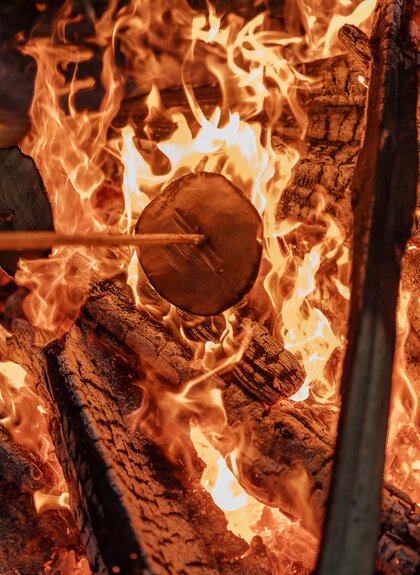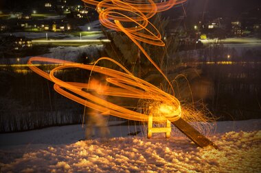 Der erste Schütze steckt eine Scheibe auf seinen Haselnussholzstock, bringt sie im Feuer zum Glühen und schlägt sie über die Holzbank ab. Unter Applaus zieht sie einen leuchtenden Bogen durch die Nacht.