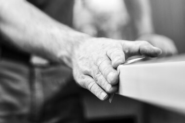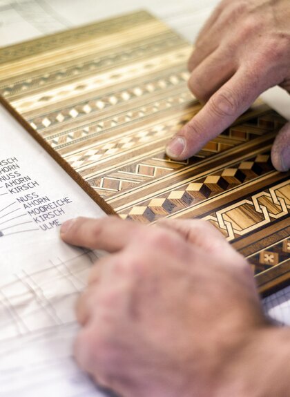 Markus Juen lernte es von seinem Vater Raimund und leitet heute die Tischlerei. Die filigranen Einlegearbeiten sind das Herzstück eines Montafonertischs. Jedes Detail muss exakt passen – sonst beginnt die Arbeit von Neuem. Rund zweieinhalb Wochen Handarbeit machen jeden Tisch einzigartig.