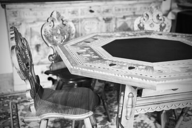 Noch heute werden die mit kunstvollen Holzverzierungen und edler Schieferplatte gestalteten Montafonertische vorwiegend in Handarbeit hergestellt.