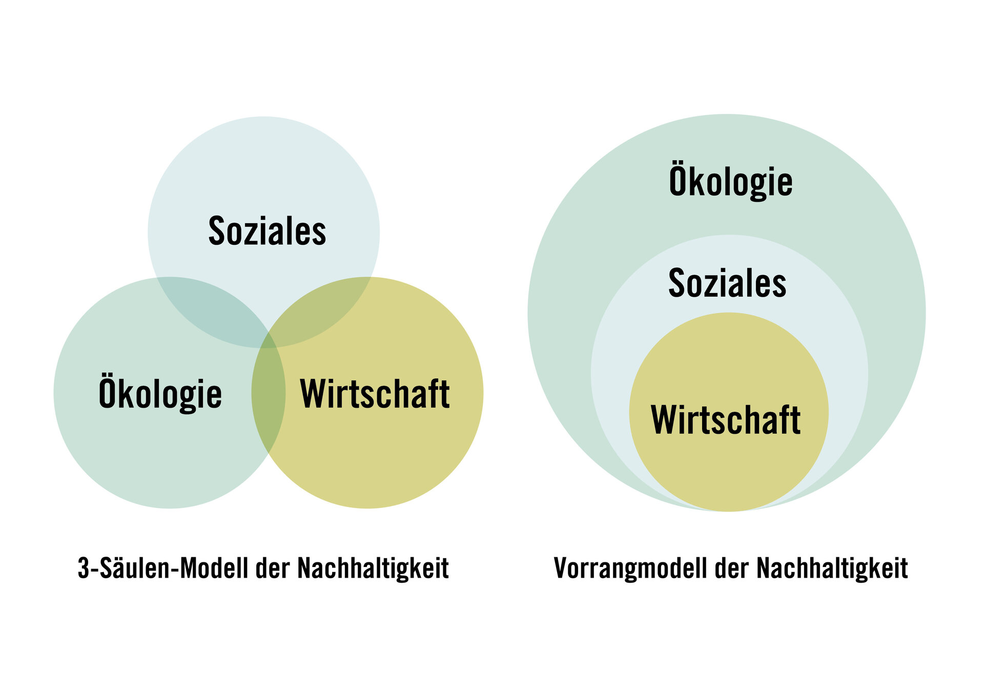 Das Vorrangmodell besagt, dass die Bereiche Ökologie, Soziales und Ökonomie nicht grundsätzlich gleichgestellt sind, sondern dass es ohne Umwelt und Natur keine soziale Stabilität gibt und ohne soziale Stabilität keine ökonomische Stabilität. Wenn sich die verschiedenen Ebenen der Nachhaltigkeit gegenüberstehen, gewinnt immer die Ökologie, weshalb hier in der öffentlichen Wahrnehmung oft der Fokus liegt. Andersrum ist die ökonomische Stabilität einer Region wichtig, um soziale und ökologische Stabilität vorantreiben zu können. Somit kommt es immer auch auf die Herangehensweise und den Blickwinkel an.