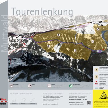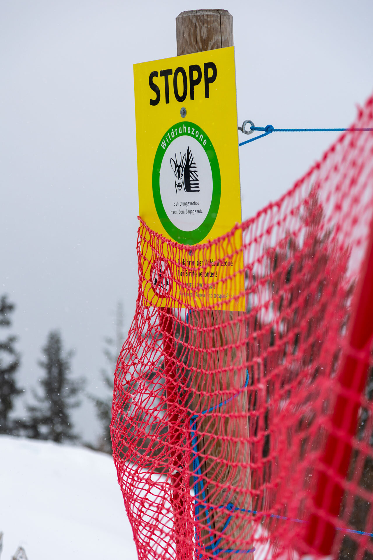 Wildruhezonen sollen dazu dienen, Rückzugsräume in besonders störungsintensiven Gebieten für unsere Wildtiere zu bewahren. In diesen sensiblen Zonen gilt ein generelles Wegegebot. Schneeschuhwanderungen und Skitouren dürfen somit nur entlang ausgewiesener Straßen und Wege unternommen werden. Wildfütterungen sind im Umkreis von 300 m zu meiden.