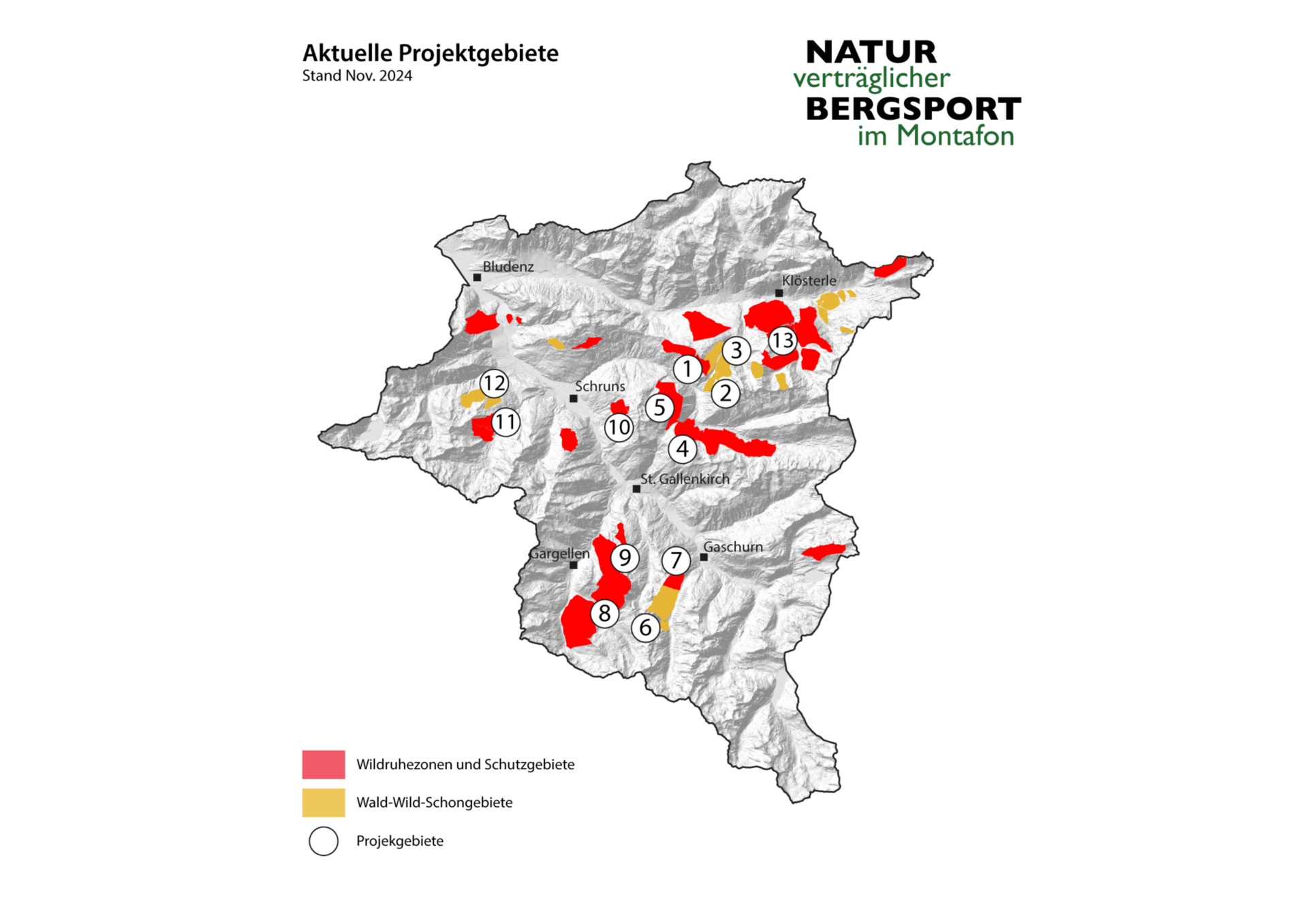 Für ausgewählte Gebiete im Montafon und im Klostertal haben sich Nutzerinnen- und Nutzergruppen, Grundeigentümerinnen und Grundeigentümer sowie Bewirtschaftende auf Bereiche geeinigt, die von Wintersportlerinnen und Wintersportlern zum Schutz von Waldflächen und Wildtieren gemieden werden sollten. Diese so genannten Wald-Wild-Schongebiete sollen sicherstellen, dass Gebiete generell weiterhin für die Ausübung von Wintersport genutzt werden können.