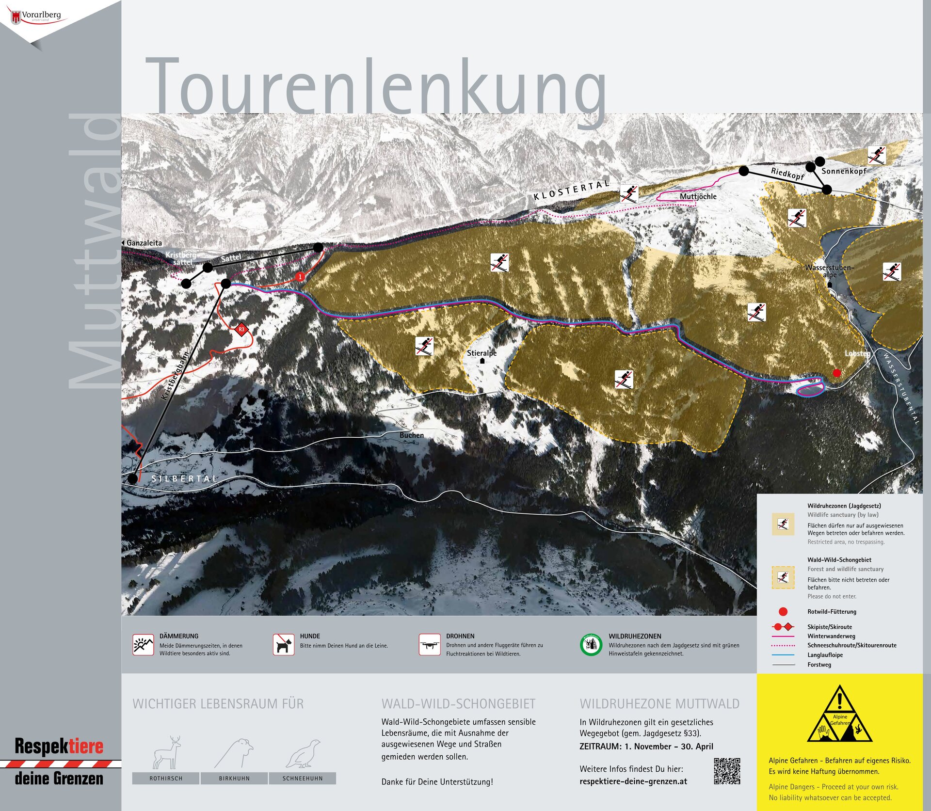 - verordnete Bestimmungen gem. Vorarlberger Jagdgesetz (Wildruhezonen, Jagdliche Sperrgebiete), Gesetz über Naturschutz und Landschaftsentwicklung (Schutzgebiete) sowie dem Bundesforstgesetz (Jungwaldflächen und Skifahren im Wald)