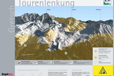 Bei Skitouren im Bereich der Alpe Gretsch (Lobspitze, Fellimännle) ist ausnahmslos über den Forstweg von der Alpe Gretsch in das Wasserstubental bzw. weiter in das Silbertal abzufahren. Sämtliche Schneisen und Lawinenrinnen, die ins Wasserstubental oder Silbertal führen, sind zu meiden, ebenso wie die waldnahen Bereiche der Alpe Gretsch. Bitte beachte die Orientierungshilfen im Gelände.