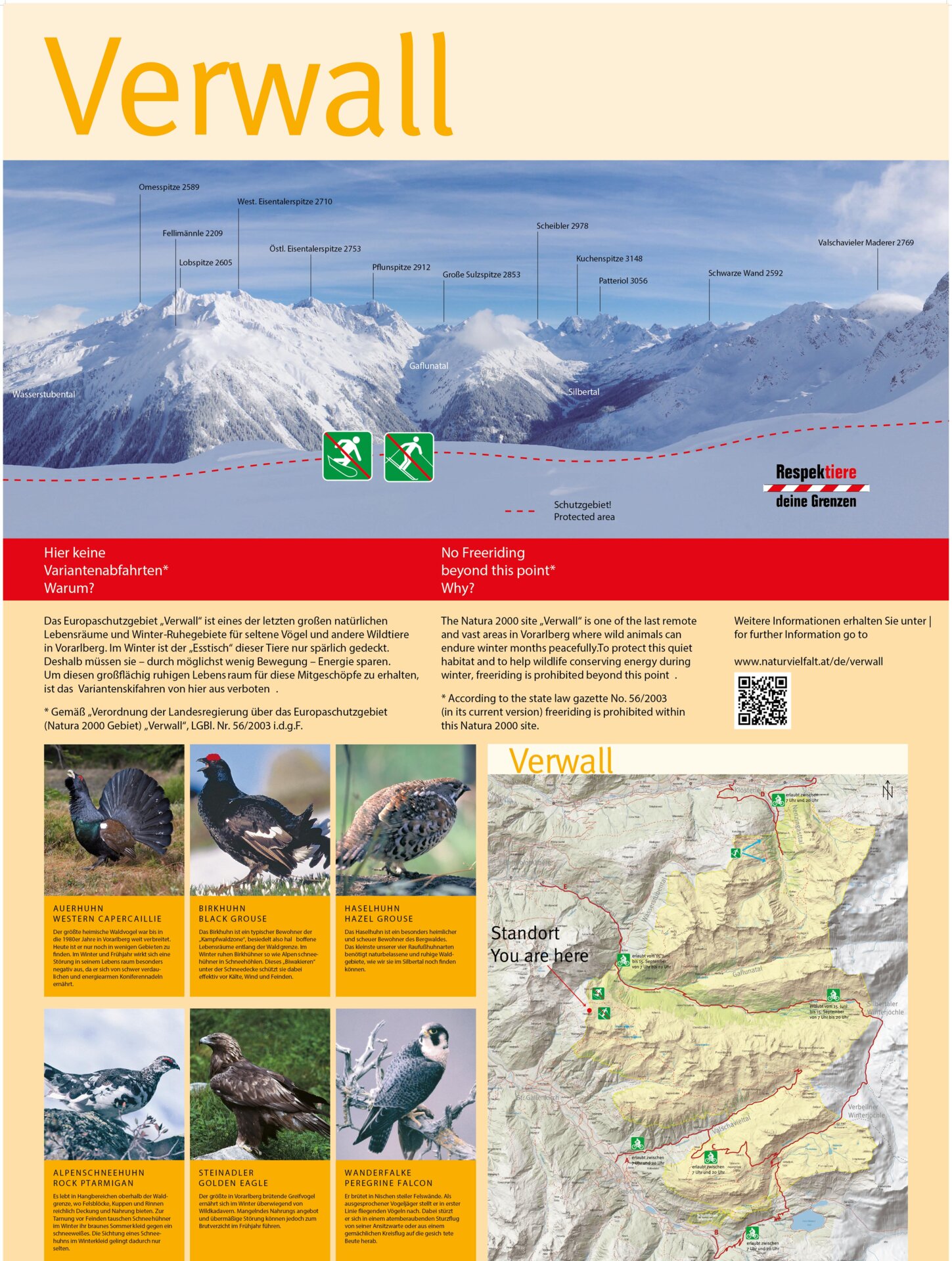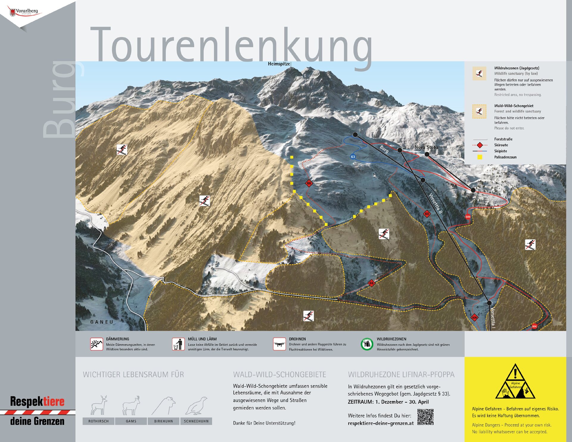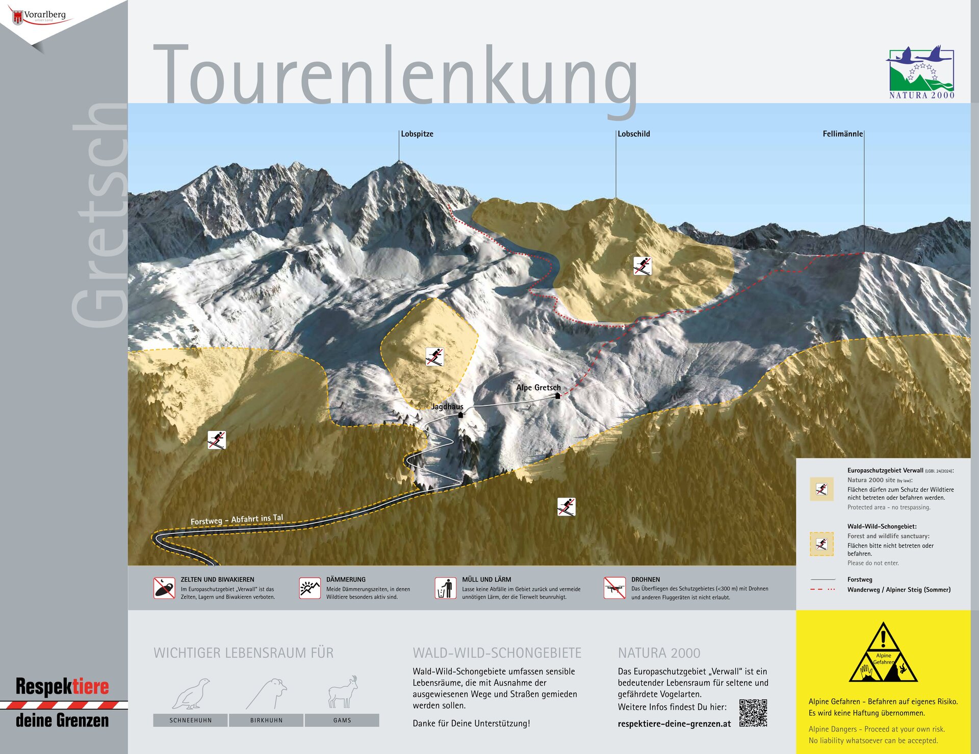 Wald und Waldrandbereiche sind häufige Aufenthaltsorte für Wildtiere und sind deshalb zu meiden, insbesondere im Nahbereich des Skigebiets Sonnenkopf (hier gilt das Befahrungsverbot gem. Forstgesetz) sowie zw. Hochburtscha und Fellimännle (siehe auch Tourenlenkung Gretsch). Bitte beachte die eingezeichneten Rückzugsräume für Gams, Schnee- und Birkhühner im Europaschutzgebiet „Verwall“.