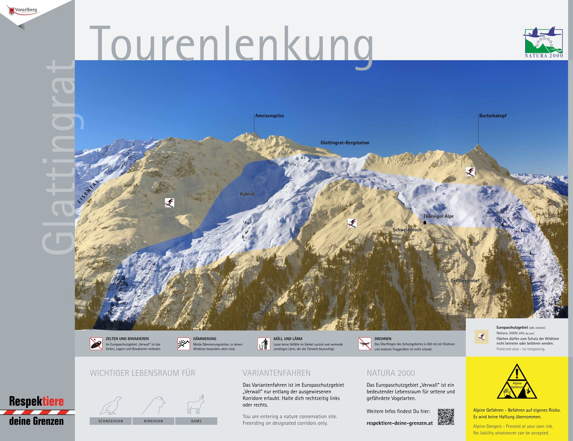 Die Variantenabfahrt von der Bergstation der Glattingratbahn (Skigebiet Sonnenkopf) in das Europaschutzgebiet Verwall (Nenzigasttal) ist entlang ausgewiesener Korridore erlaubt. Diese verlaufen über das Alt-Maisäß sowie das Kuhtäli und den Bereich nördlich des Rinderberges. Eine Übersicht über den Verlauf der Korridore findet sich auf der Informationstafel im Bereich der Bergstation. Die Abfahrt erfolgt auf eigene Gefahr (freier Skiraum, keine Skiroute) und ist nur bei entsprechender Gebiets- und Geländekenntnis zu empfehlen. Der Korridor im Bereich Alt-Maisäß (rechter Korridor auf der Karte) wurde Ende 2018 aufgelichtet, um die Befahrbarkeit zu erleichtern. Halte dich - wenn möglich - auf diesem Korridor.
