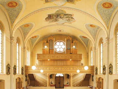 Altar- und Deckenbilder der Schrunser Brüder Franz und Jakob Bertle im späten Nazarenerstil.