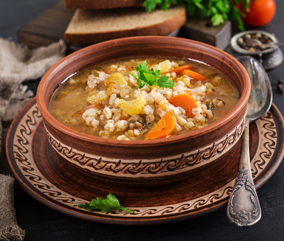 Bohnen am Tag zuvor in Wasser einweichen. Rollgerste 2 Stunden in Wasser einweichen und danach gut abwaschen. Bohnen in Wasser 90 Minuten weich kochen – nicht salzen, da sonst die Bohnen nicht weich werden. Gerste, Speck und Selchfleisch dazugeben. Nach 1 Stunde Garzeit das Selchfleisch und den Speck wieder herausnehmen, abkühlen lassen und in kleine Würfel schneiden.