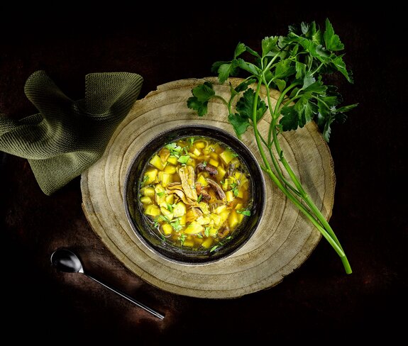 Erdäpfel waschen, schälen, in erbsengroße Stücke schneiden und in kaltes Wasser geben. Die Zwiebeln in feine Würfel schneiden. Den Lauch in dünne Streifen (Julienne) und die Steinpilze in feine Scheiben schneiden. Falls man getrocknete Steinpilze verwendet, diese in Weißwein einlegen. Zwiebeln, Lauch, Erdäpfel und Steinpilze in Olivenöl glasig anschwitzen, mit Gemüsefond aufgießen und kochen, bis die Erdäpfel bissfest sind.